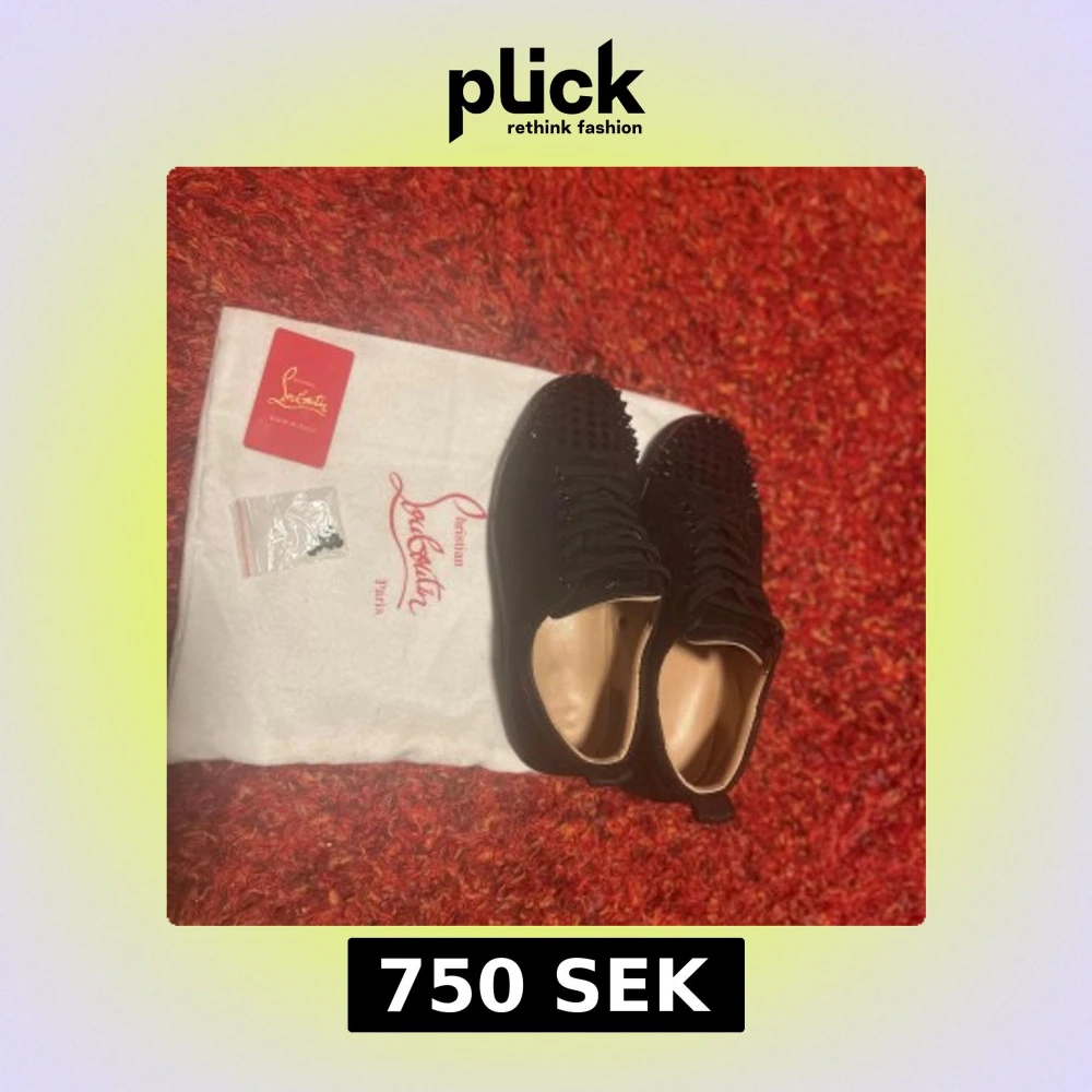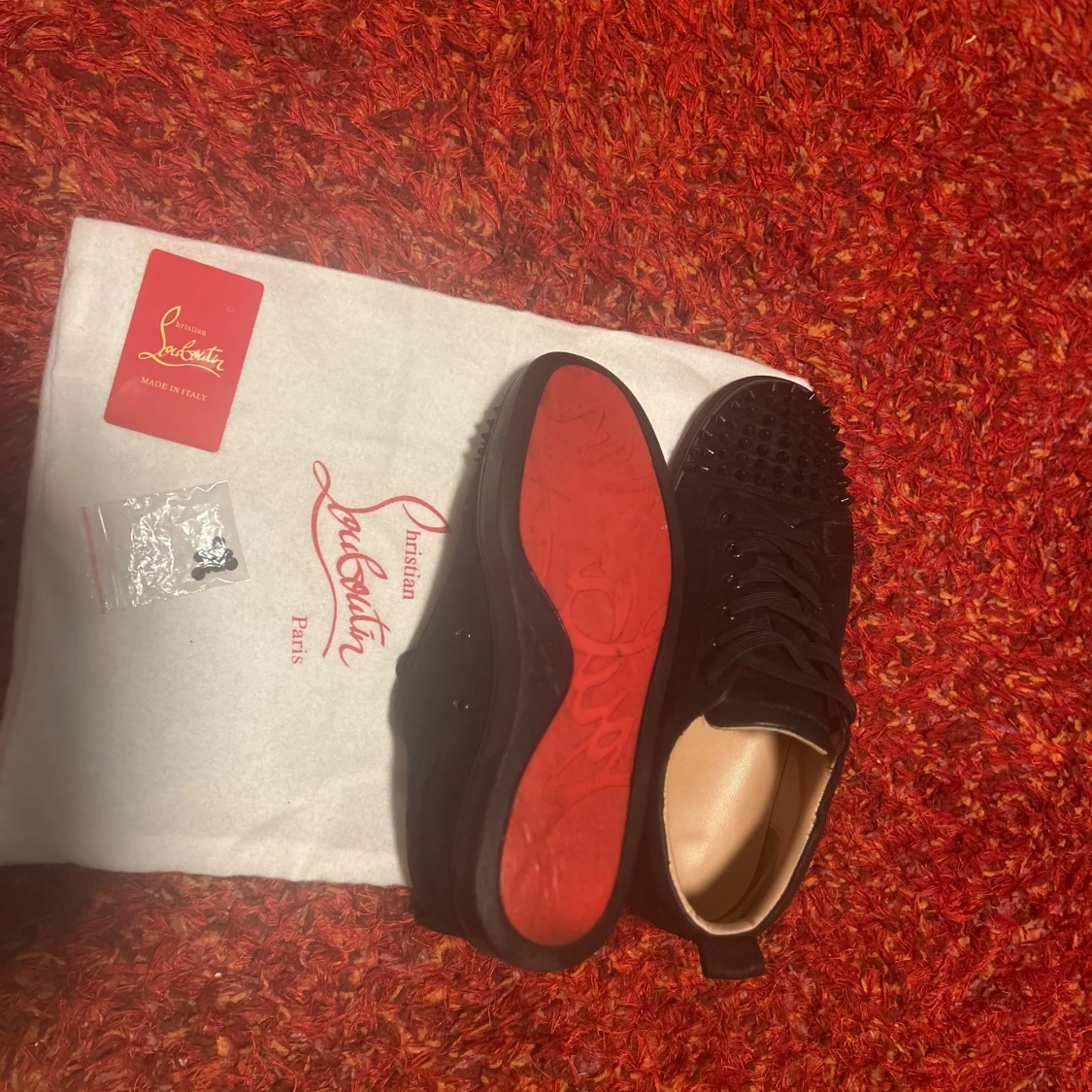 Säljer ett par svarta sneakers från Christian Louboutin med ikoniska röda sulor och svarta nitar på tån. Skorna har snörning och är tillverkade i skinn. Kommer med originalpåse och extra skosnören.