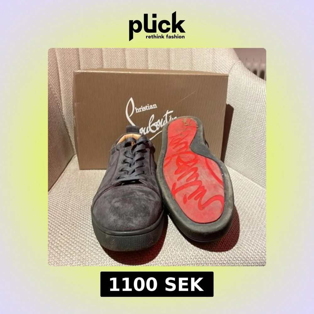 Snygga gråa sneakers från Christian Louboutin i mocka med klassisk röd signatursula. Skorna har rund tå, platt sula och snörning framtill. Insidan är i beige skinn och utsidan har en stilren, mörk look. Perfekt för dig som gillar exklusiva märken och vill sticka ut.
