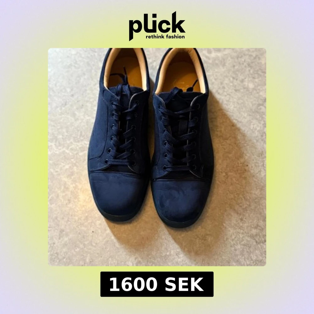 Snygga mörkblå sneakers från Christian Louboutin i mocka med klassisk röd sula och broderad logga på hälen. Perfekta för dig som vill sticka ut med exklusiva detaljer. Knappt använda, inga fel på skorna. Pris kan diskuteras. Passar även folk i storlek 43