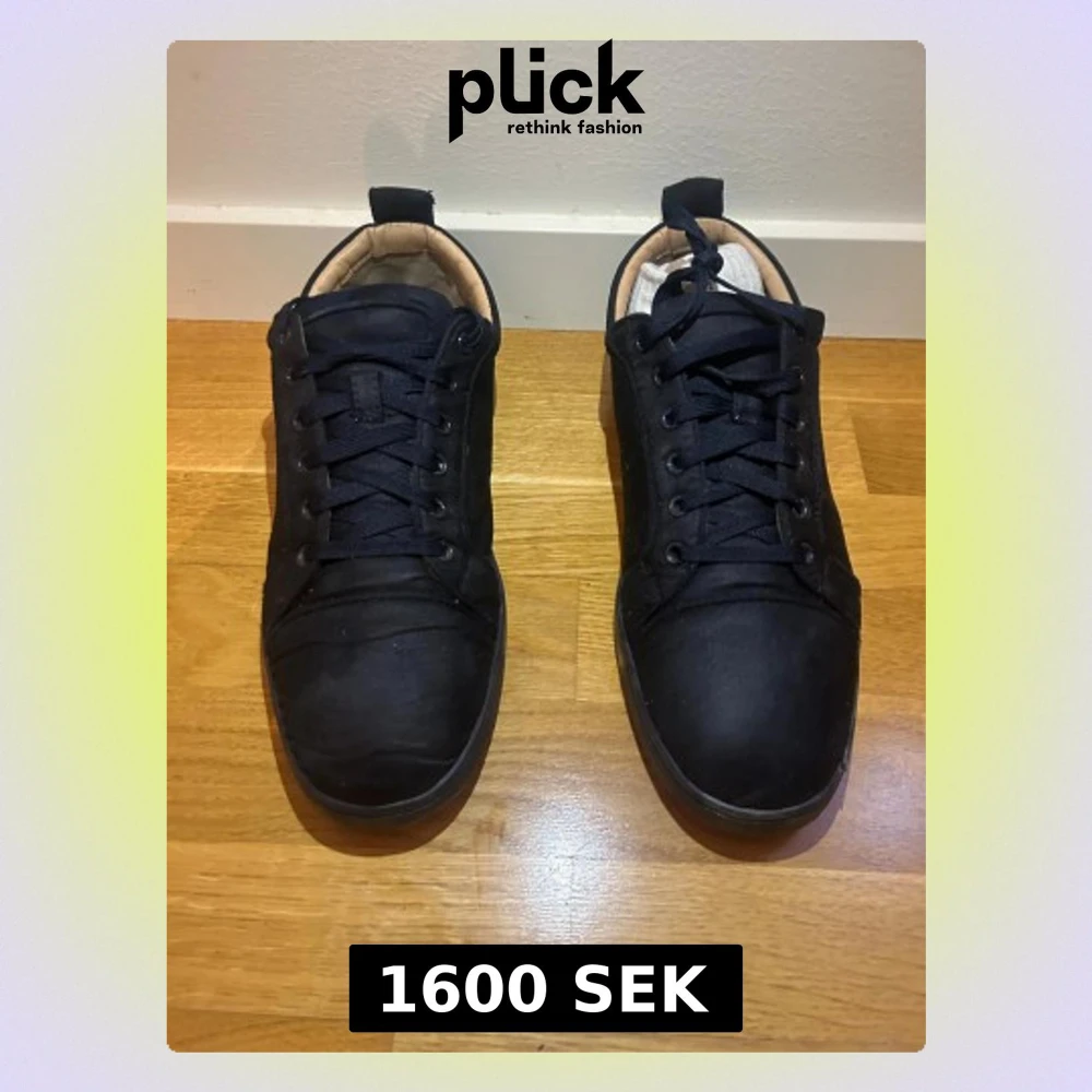 Säljer ett par svarta sneakers från Christian Louboutin i storlek 45. Skorna har klassisk röd sula, svart ovandel i textil och skinn, samt broderad Louboutin-logga på hälen. Insidan är fodrad i beige skinn för extra komfort. Sulan är lite slipen fast det är fortfarande ett par grymma skor med lyxig känsla och snygga detaljer. Pris kan såklart diskuteras! 🤝