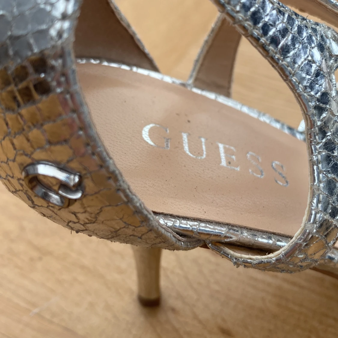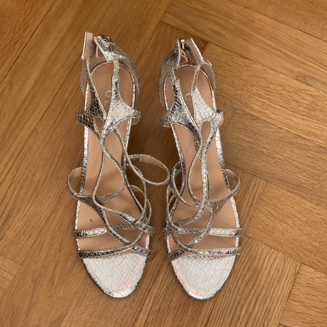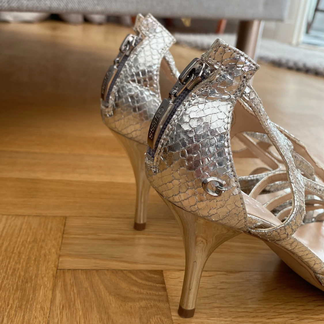 Snygga silvriga sandaler från Guess med hög klack och ormskinnsmönster. Skorna har flera smala remmar, öppen tå och dragkedja bak med metall-detaljer. Perfekta för dig som vill sticka ut med ett glittrigt statement.