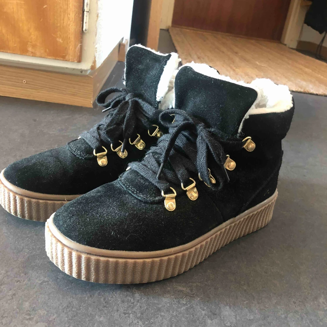Isabel Marant svarta sneakers med kilklack - Säljer ett par svarta Isabel Marant sneakers med kilklack och kardborreband. Skorna har en mix av mocka och skinn, beige insida och gummisula i naturfärg. De har en chunky siluett och högt skaft som ger en riktigt cool streetstyle-vibe.