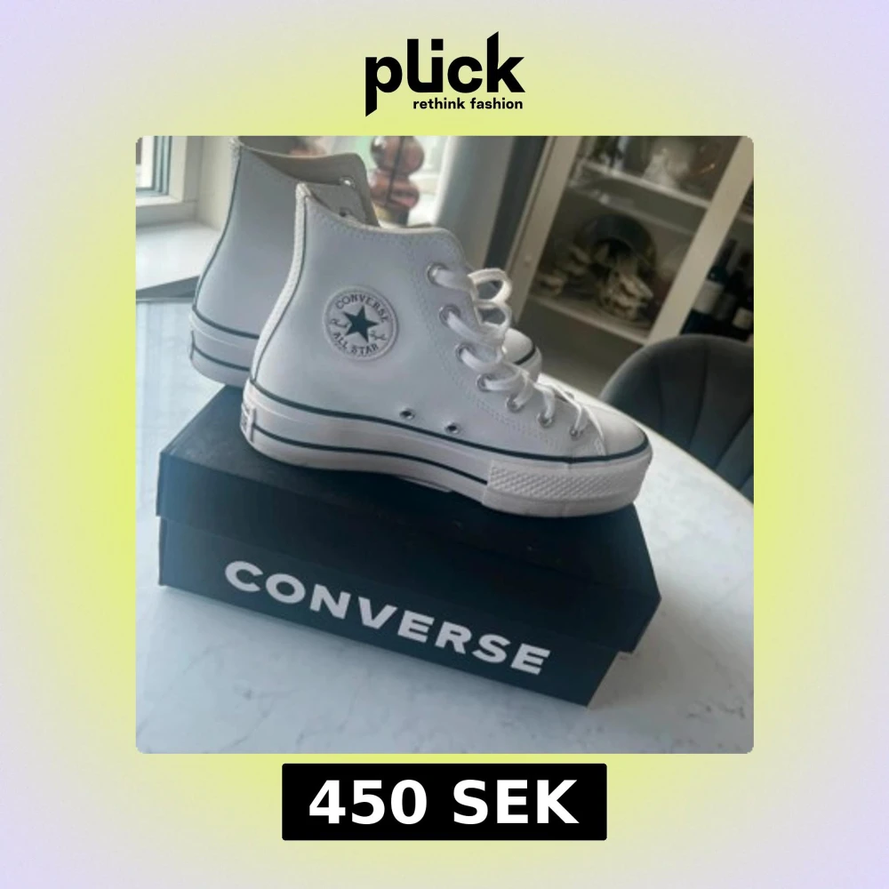 Säljer ett par klassiska vita Converse All Star sneakers i hög modell. Skorna har snörning och den ikoniska logotypen på sidan. Perfekta för en stilren och avslappnad look.