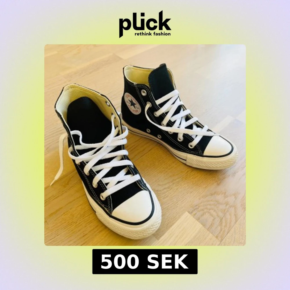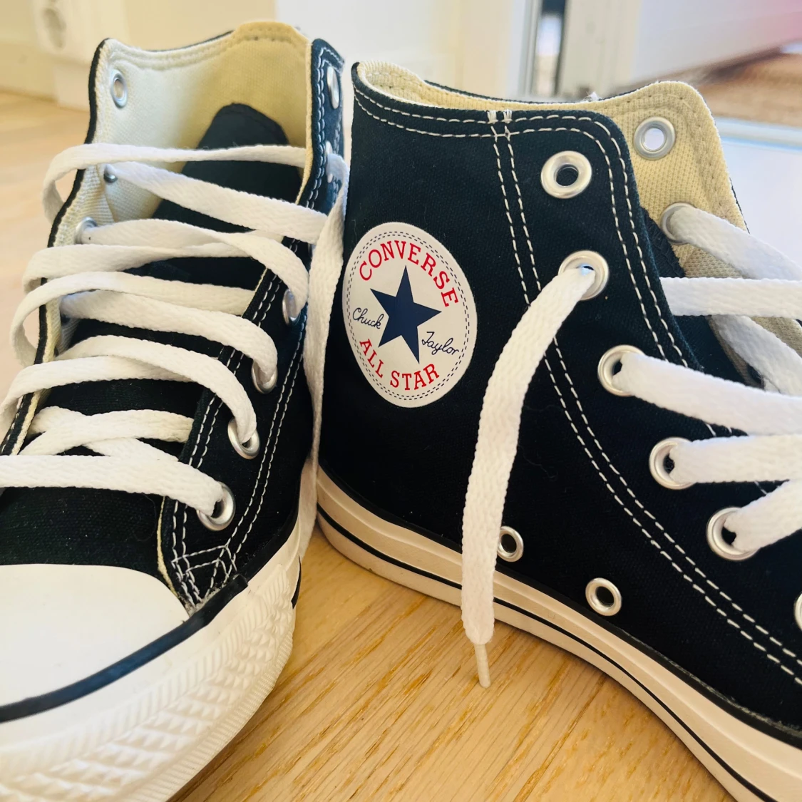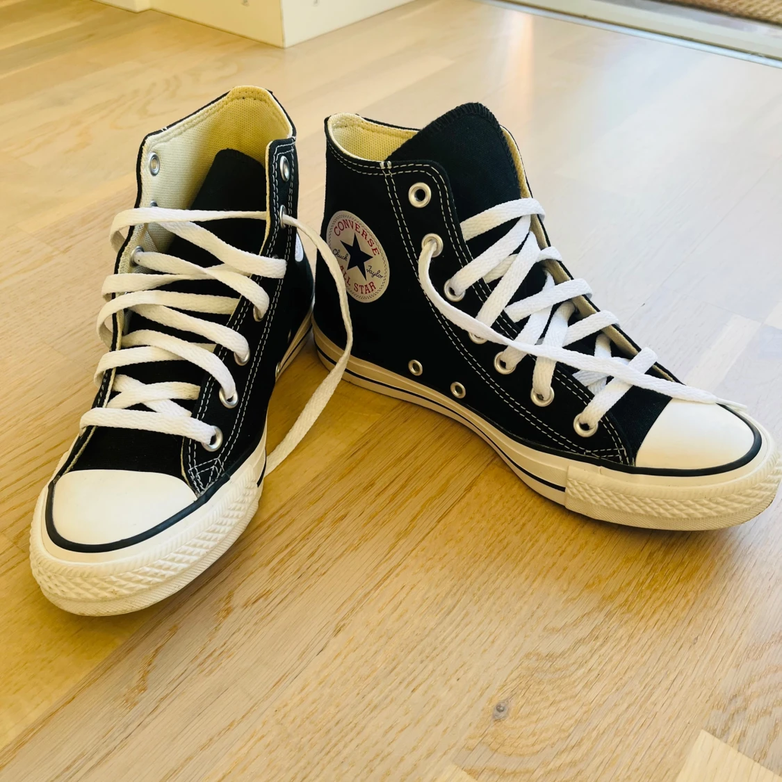 Klassiska svarta Converse Chuck Taylor All Star high-tops med vit sula och tå, vita snören och tydliga kontrastsömmar. Ikonisk logga på sidan och metallöljetter. Ovandel i canvas och platt gummisula. Perfekta för en cool och avslappnad stil.