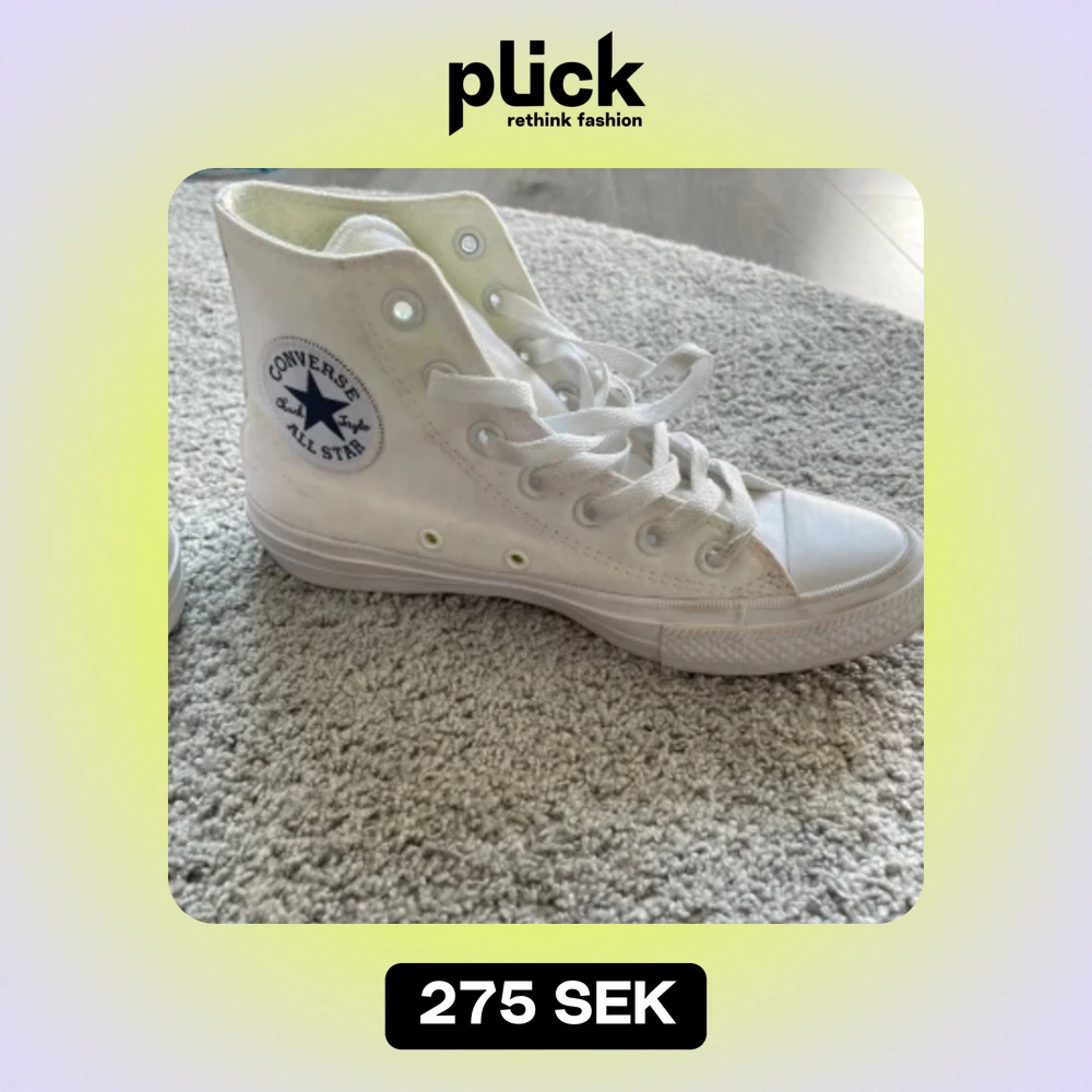 Säljer ett par klassiska vita Converse All Star sneakers i hög modell. Skorna har den ikoniska loggan på sidan och är i ny skick med vita snören och en gummisula. Perfekta för en avslappnad stil och passar till det mesta i garderoben.