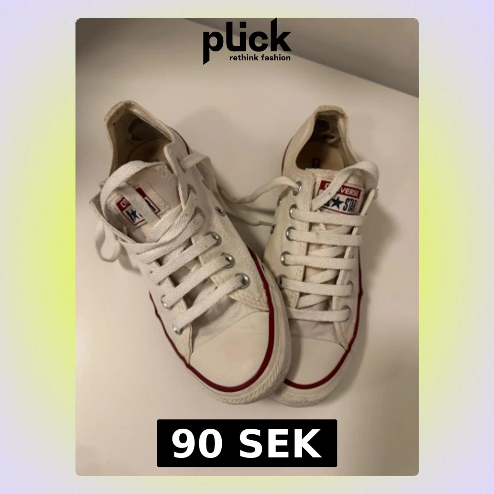 Säljer ett par klassiska vita Converse All Star sneakers i storlek 37. Skorna har lågt skaft, rund tå och snörning med metallöglor. Yttermaterialet är i textil och sulan i gummi, med röd rand längs kanten. Perfekt för dig som gillar tidlös streetstil.