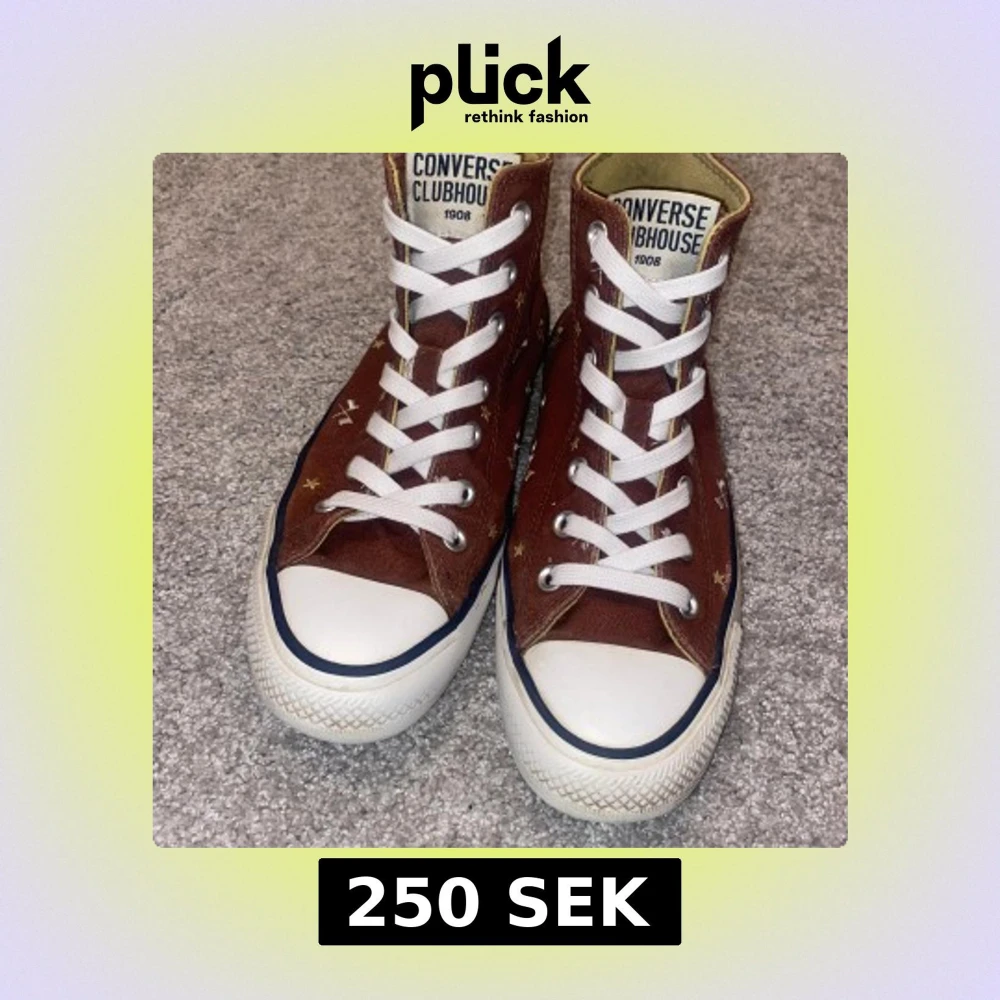 Snygga bruna Converse med vita snören och stjärndetaljer. Klassisk hög modell. De är i bra stick de har bara små hålar in i skor men det märks inte.