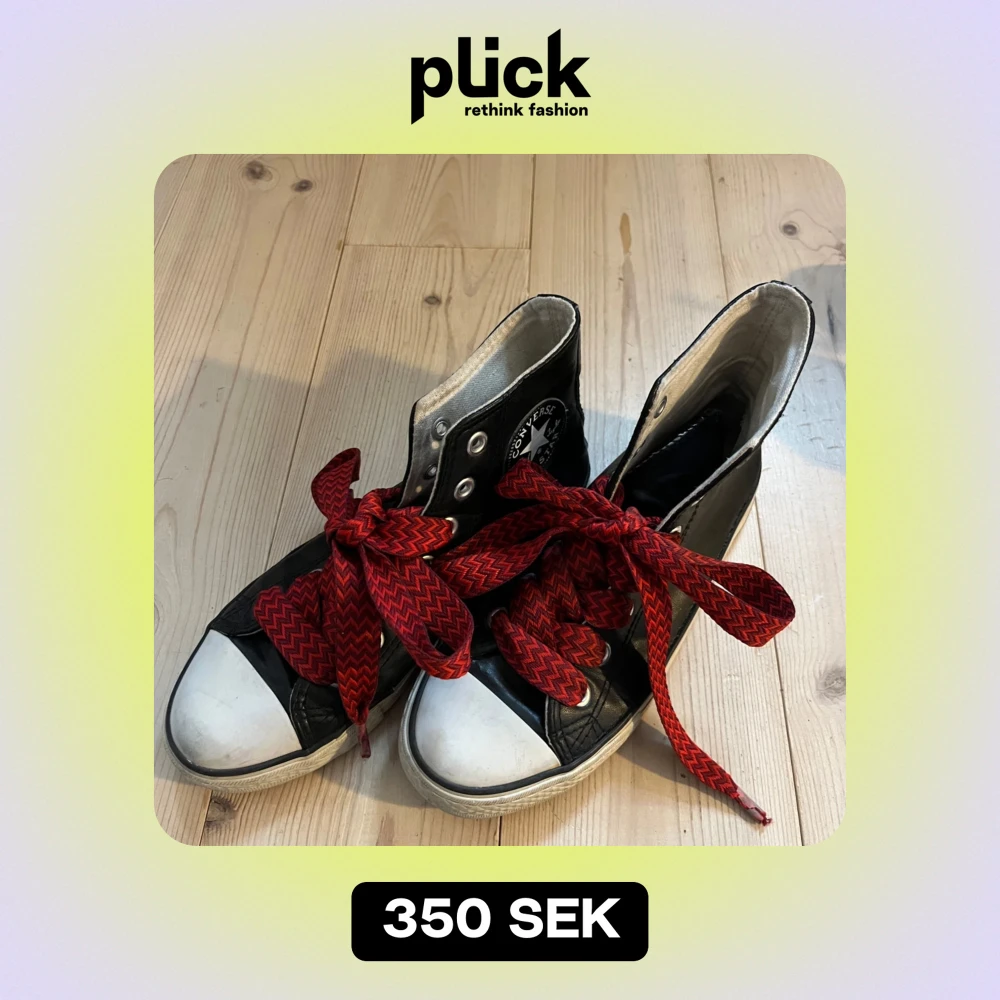 Säljer ett par läderconverse som jag satt på nya coola röda snören. Conversen har släppt lite i sulan men fungerar fortfarande (se sista bilden)