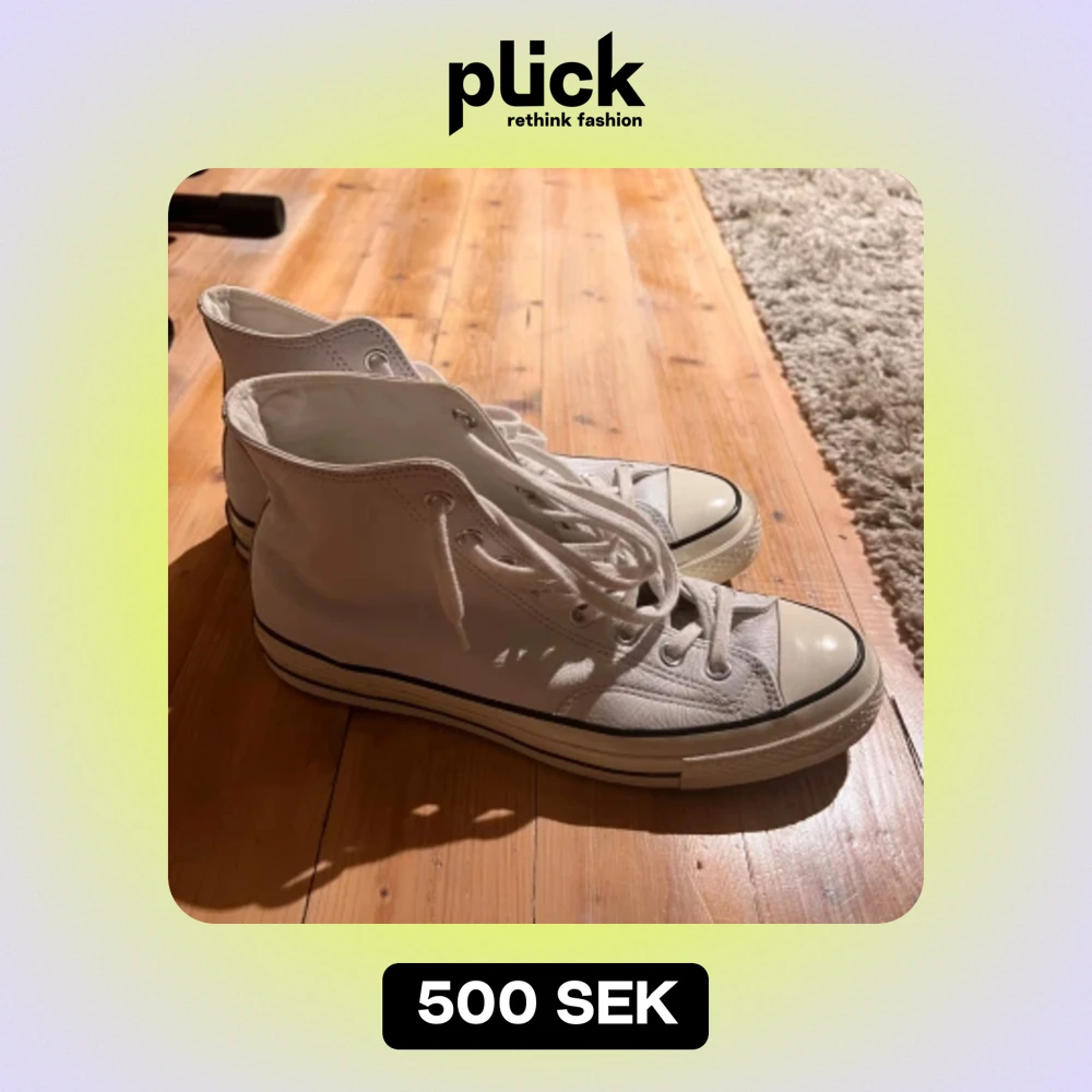 Säljer dessa vita läder converse som endast är en sample så du kommer definitivt vara ensam med att ha dessa. Skorna är bara använda ett fåtal gånger vilket ni kan se på sulan som fortfarande är i nyskick. Eftersom dessa är samples finns det ingen