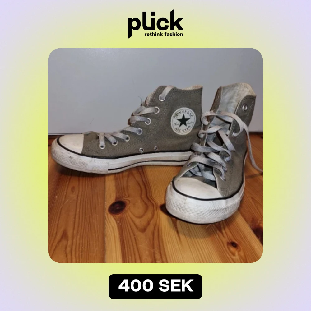 Grå Converse i mycket bra skick. Inte nötta, varken sula eller tyg, men någon smutsfläck på det vita. Skosnörena kan man ju byta om man tycker de är slitna. Storlek 5 (ca 37,5). Säljer för att de tyvärr blivit för små.