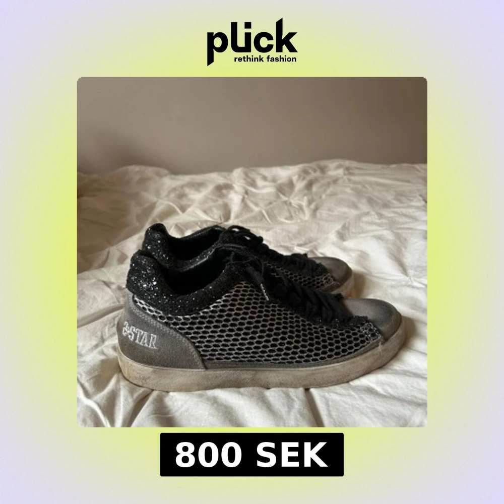 Snygga svarta sneakers från 2-Star (vera Pelle) med glittrig häl och nätmönster. Skorna har en robust sula och klassisk snörning. Perfekta för en trendig look. Köpta för 1500 och använt få gånger. Pris kan diskuteras