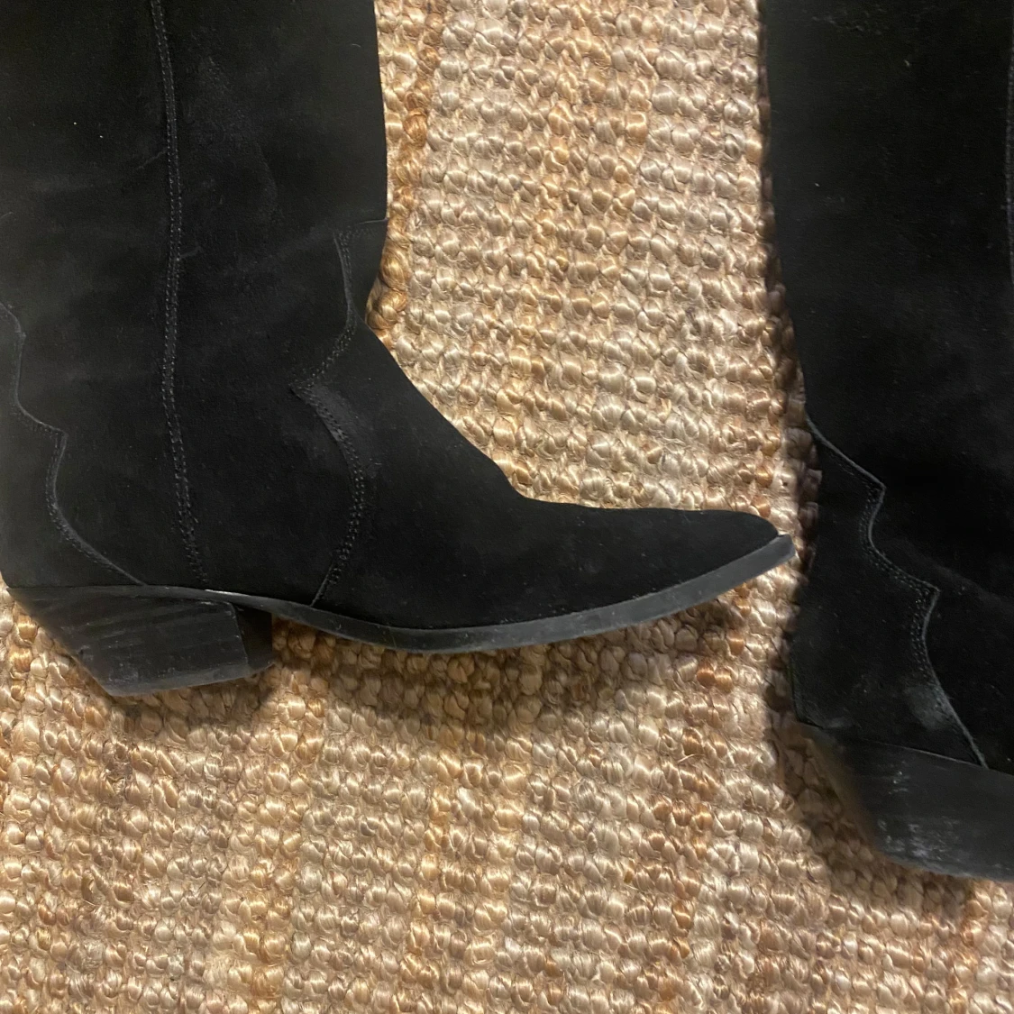 Snygga svarta boots i mocka med spetsig tå och låg klack. Perfekta för en stilren look med en touch av elegans. Passar utmärkt till både jeans och klänning. Äkta mockaläder