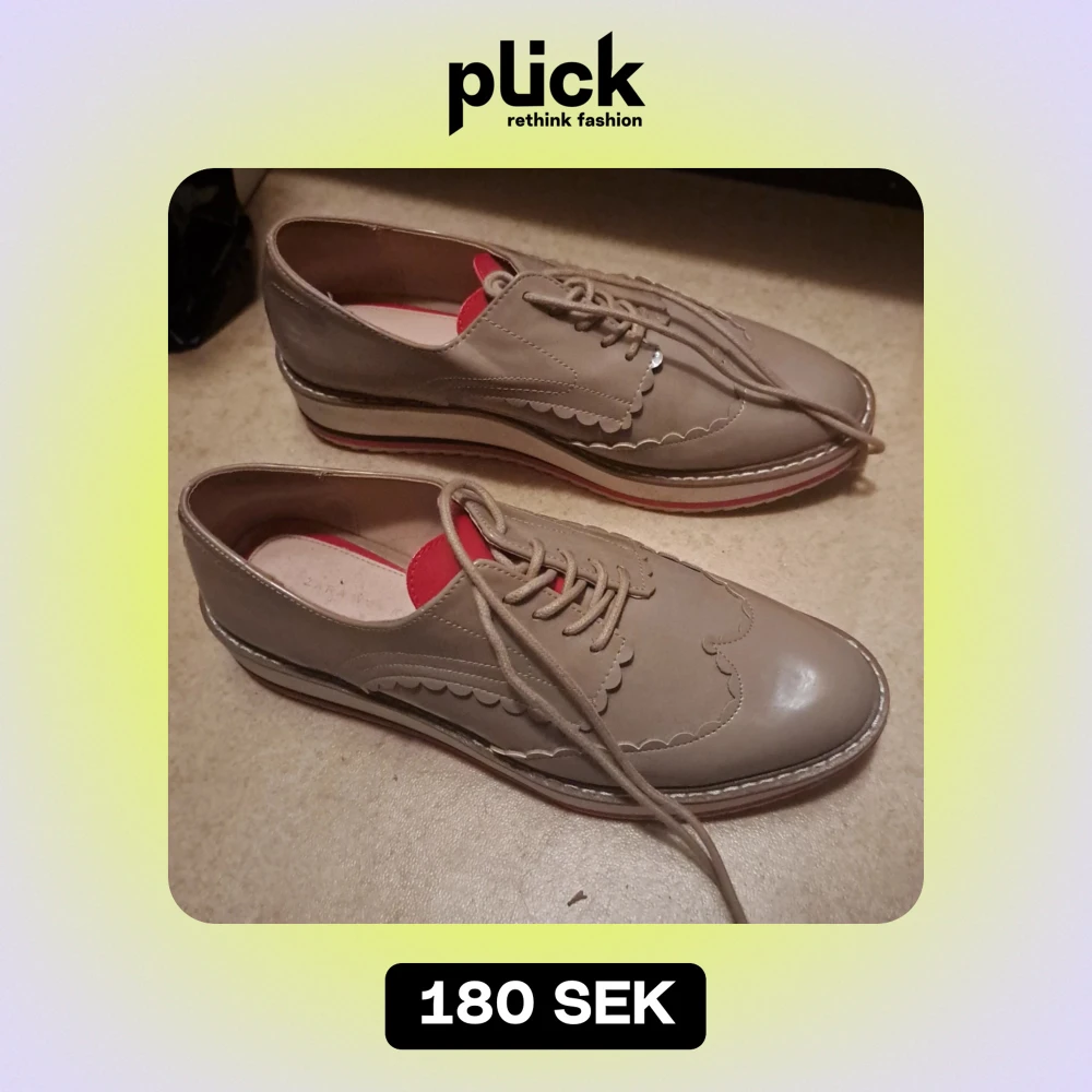 Säljer ett par snygga beige brogues med coola röda detaljer på insidan och sulan. Skorna har klassisk snörning och en vågig kantdesign som ger dem en unik look. Perfekta för både vardag och fest! De är i bra skick och redo för nya äventyr.