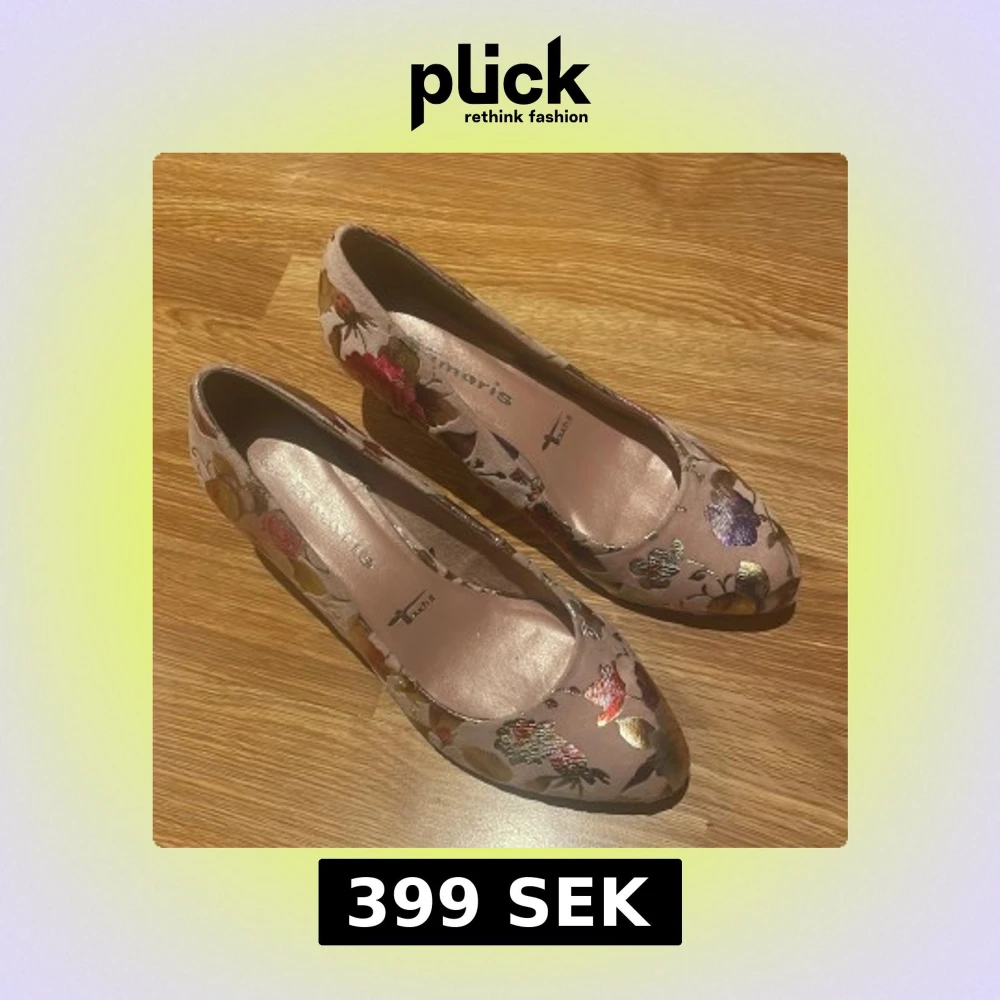 Säljer ett par eleganta pumps från Tamaris med blommigt mönster i flera färger. Skorna har en bekväm klack och en spetsig tå, vilket ger en stilren look. Perfekta för att sätta färg på din outfit! köpt för ca 1600 kr