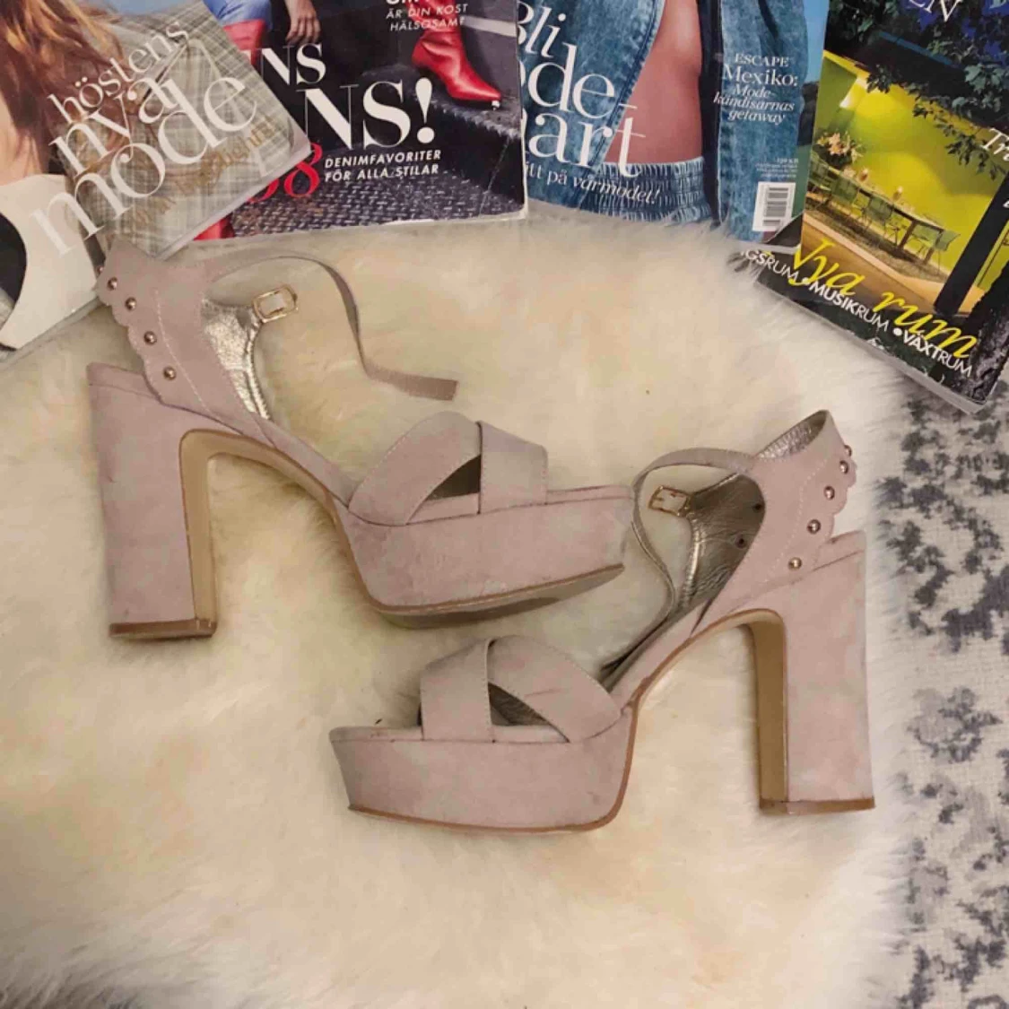 Beiga klackskor med öppen tå och 12cm klack (inkl. 4cm platå). Använda 1 gång och är i fint skick. Märket är Depeche. Fraktar ej men möts gärna upp och tar endast emot Swish-betalning.✨