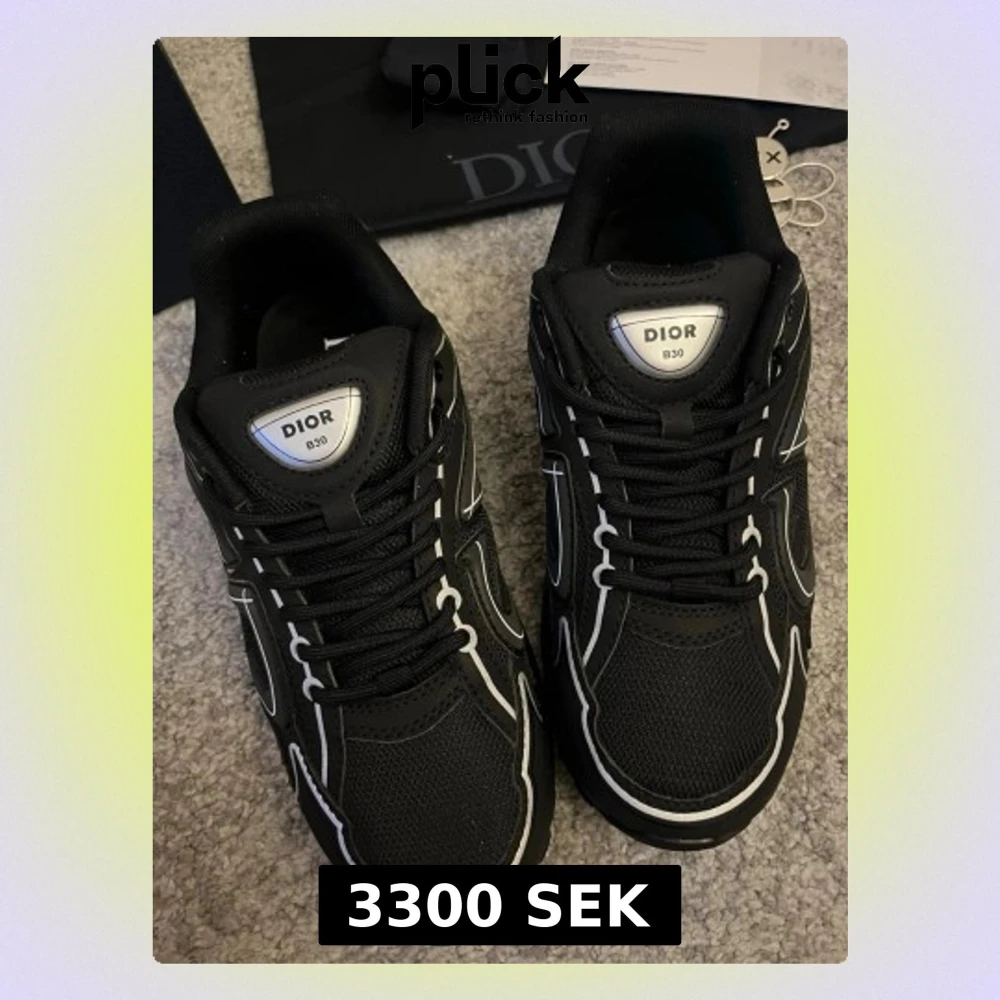 Säljer ett par svarta Dior B30 sneakers med vita detaljer och reflekterande inslag. Skorna har en chunky sula, meshpaneler och skinnpartier samt tydlig Dior-logga på sidan. Snygg och modern design som sticker ut. Levereras med originalkartong och dustbag.