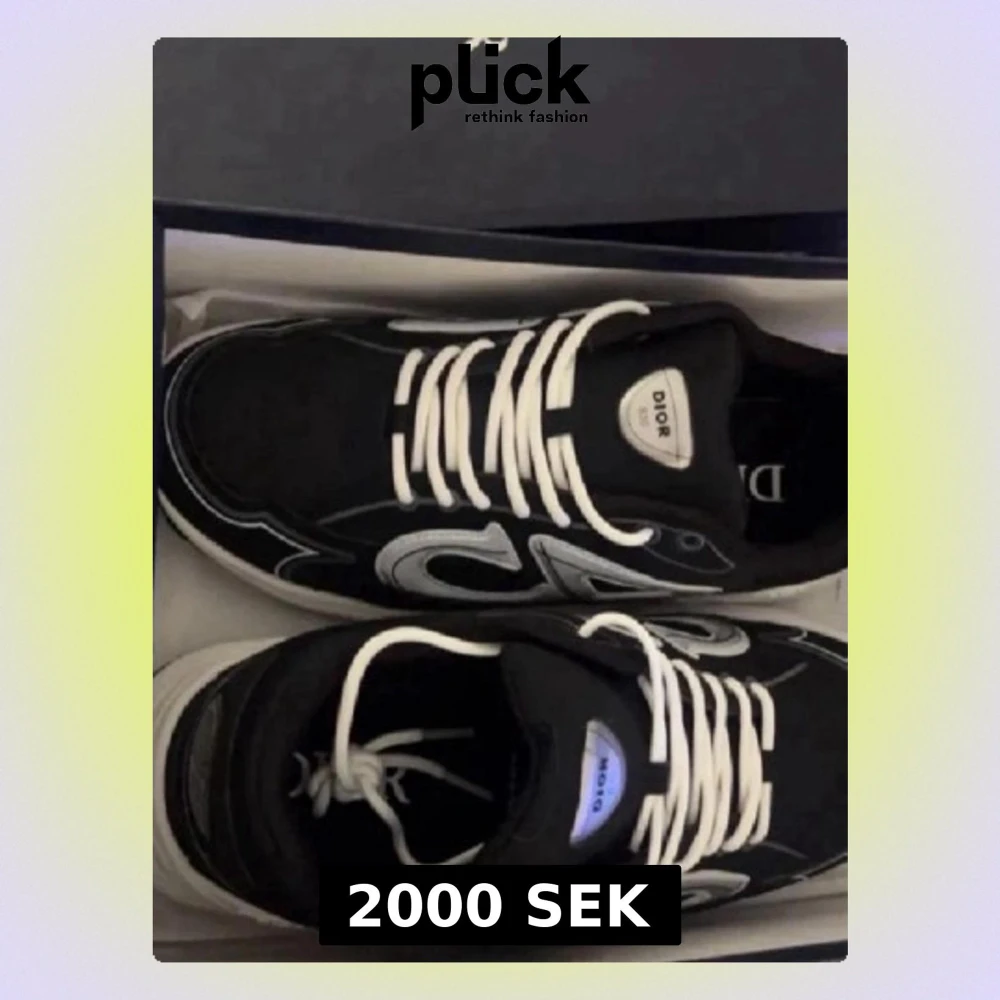Säljer ett par Dior B30 sneakers i svart med vit och silverfärgad logga på sidan. Skorna har rund tå, platt sula och vita snören. Materialet är en mix av mesh och syntet med detaljer i skinn.