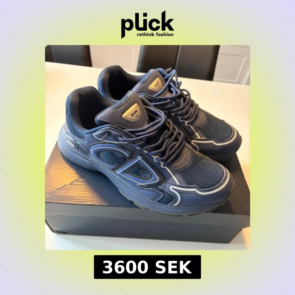 Säljer ett par snygga Dior B30 sneakers i marinblått med vita detaljer. Skorna har en chunky sula, meshpaneler och coola reflekterande linjer längs sidorna. Stort CD-logo på sidan och snörning framtill. Perfekt för dig som gillar exklusiva och trendiga sneakers. Pris kan diskuteras vid snabbaffär!
