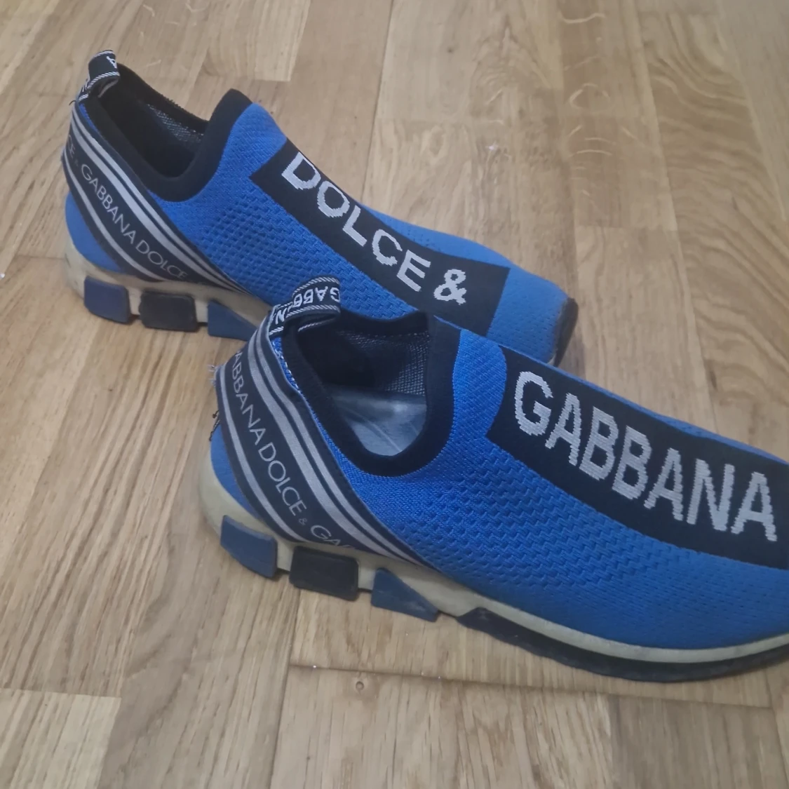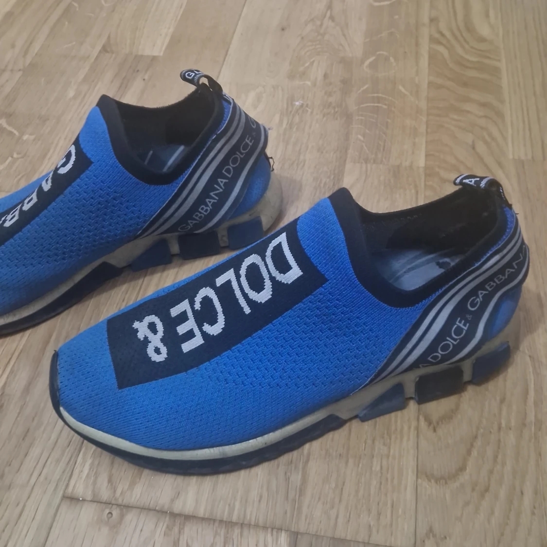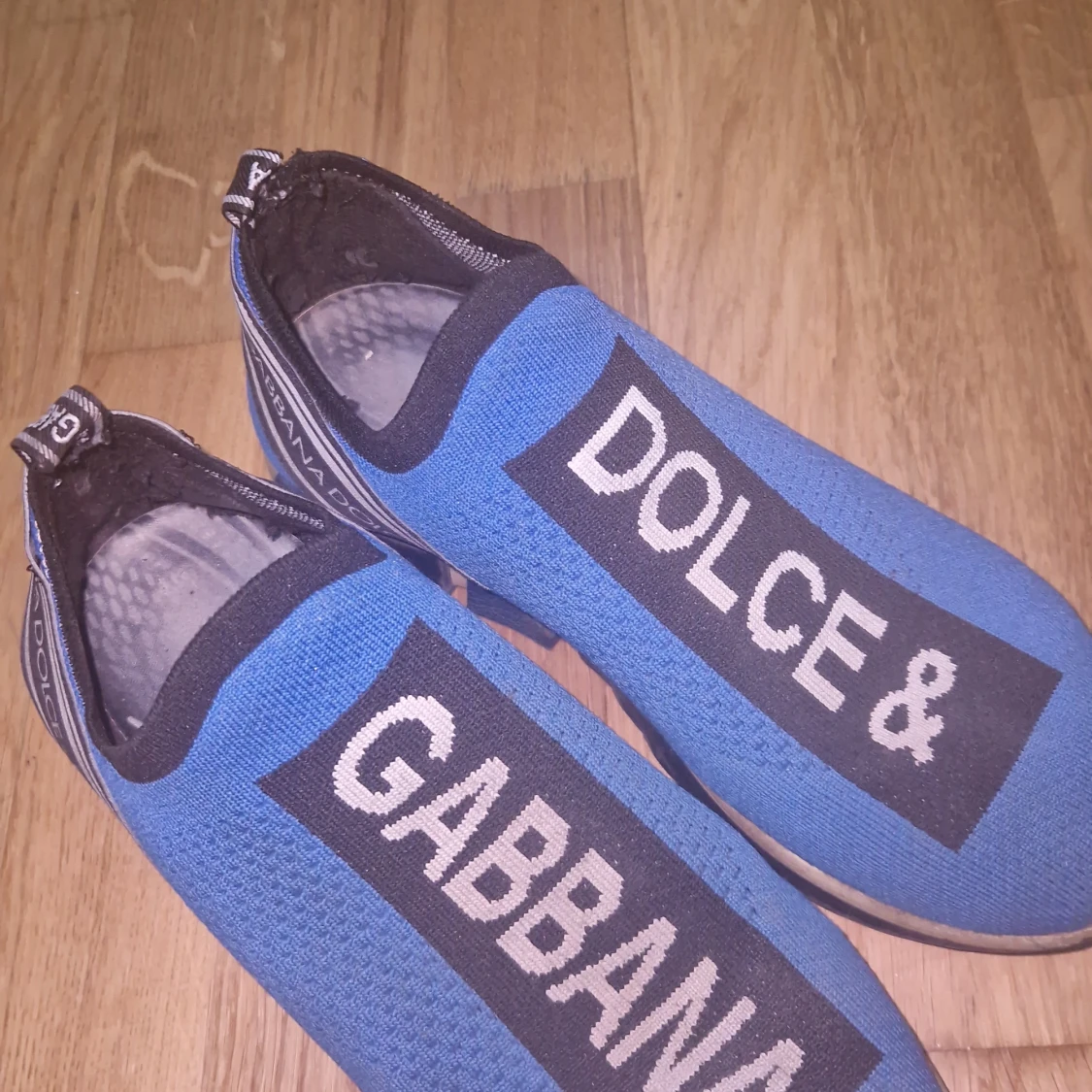 Säljer ett par blå sneakers från Dolce & Gabbana med tydlig logga på ovansidan och hälen. Skorna har en sportig design med elastisk ovandel i syntetmaterial och svart-vit sula. Perfekta för dig som vill sticka ut med en cool och modern look.