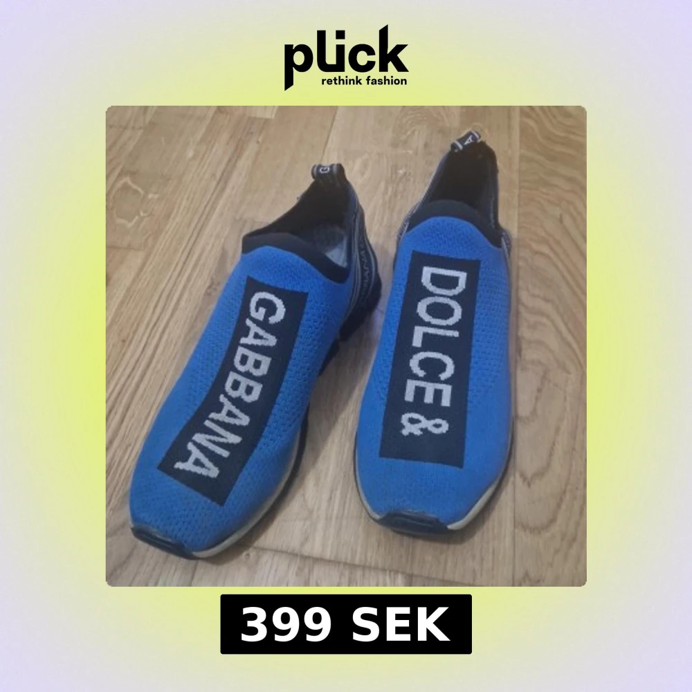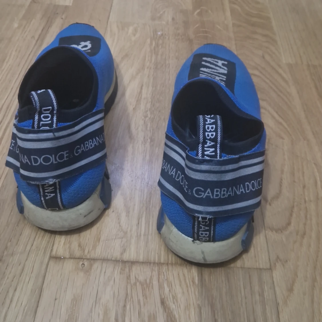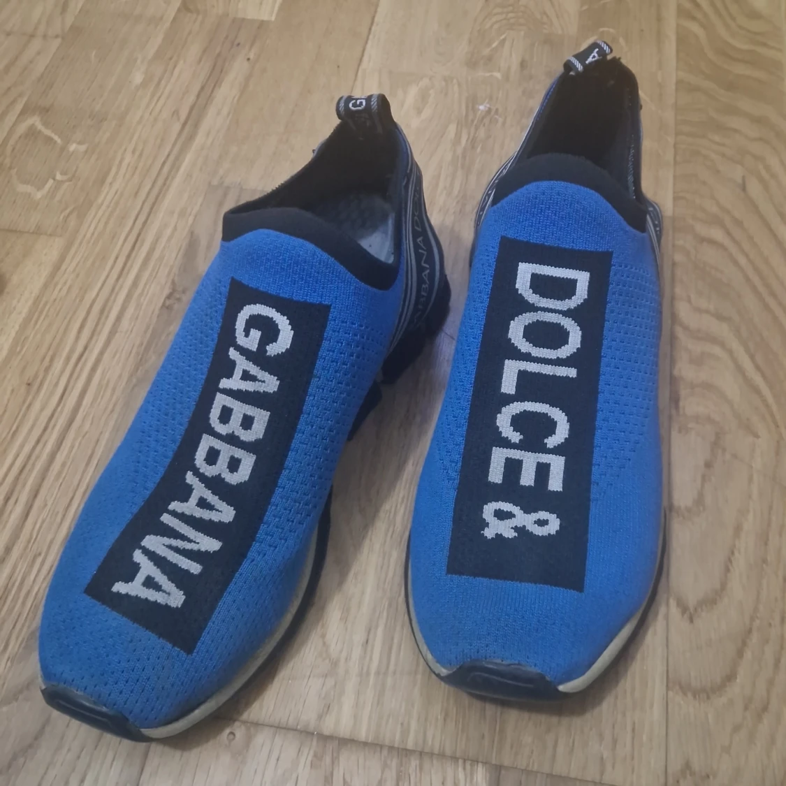 Säljer ett par blå sneakers från Dolce & Gabbana med tydlig logga på ovansidan och hälen. Skorna har en sportig design med elastisk ovandel i syntetmaterial och svart-vit sula. Perfekta för dig som vill sticka ut med en cool och modern look.