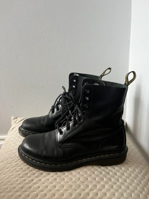 Dr. Martens kängor  - Säljer ett par svarta Dr. Martens boots med grov sula och gul söm runt kanten. Skorna har snörning och är fodrade med mjukt svart material för extra värme. Häl delen av skons material har lossnat off känns när man går i dom. Annars är skorna i fint skick