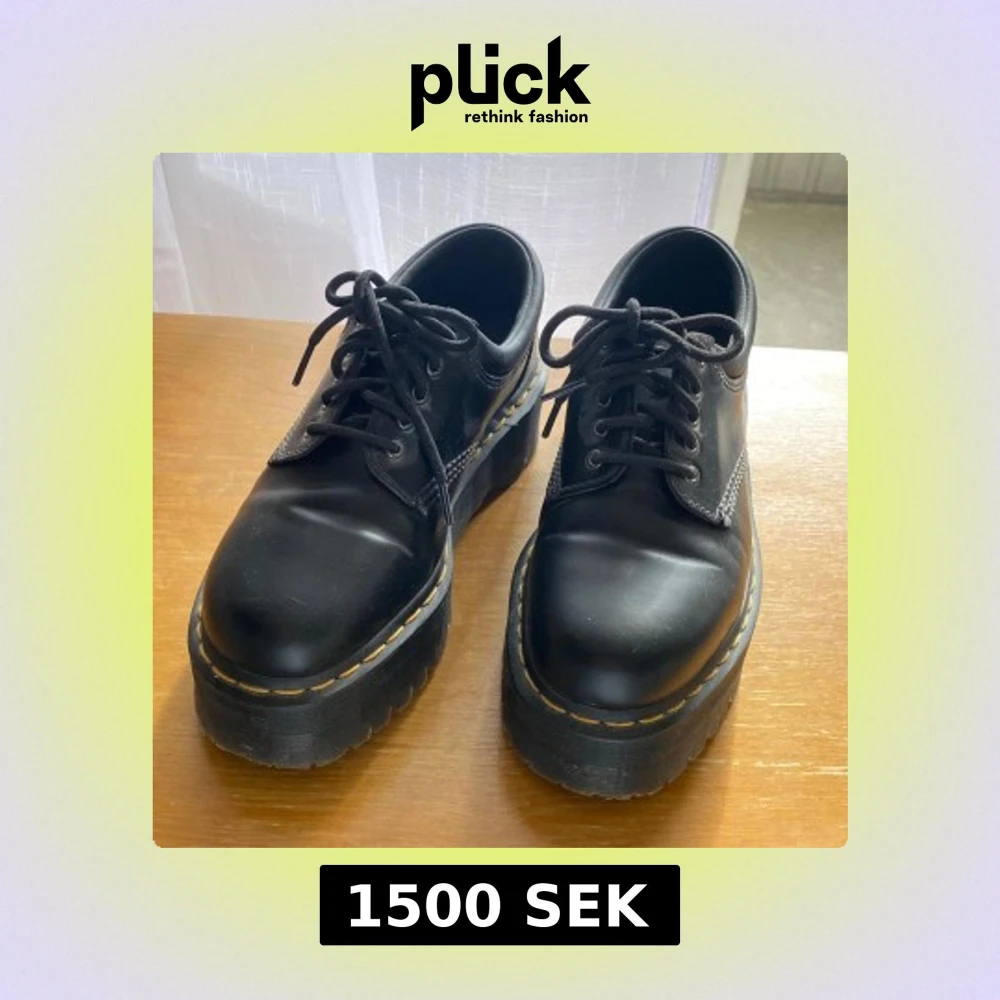 Klassiska svarta Dr. Martens med kraftig platåsula och ikoniska gula sömmar. Skorna har rund tå, snörning och är tillverkade i skinn. Perfekta för dig som vill ha en edgy och tidlös look med extra höjd. Litet märke på höger sko, inget som syns.