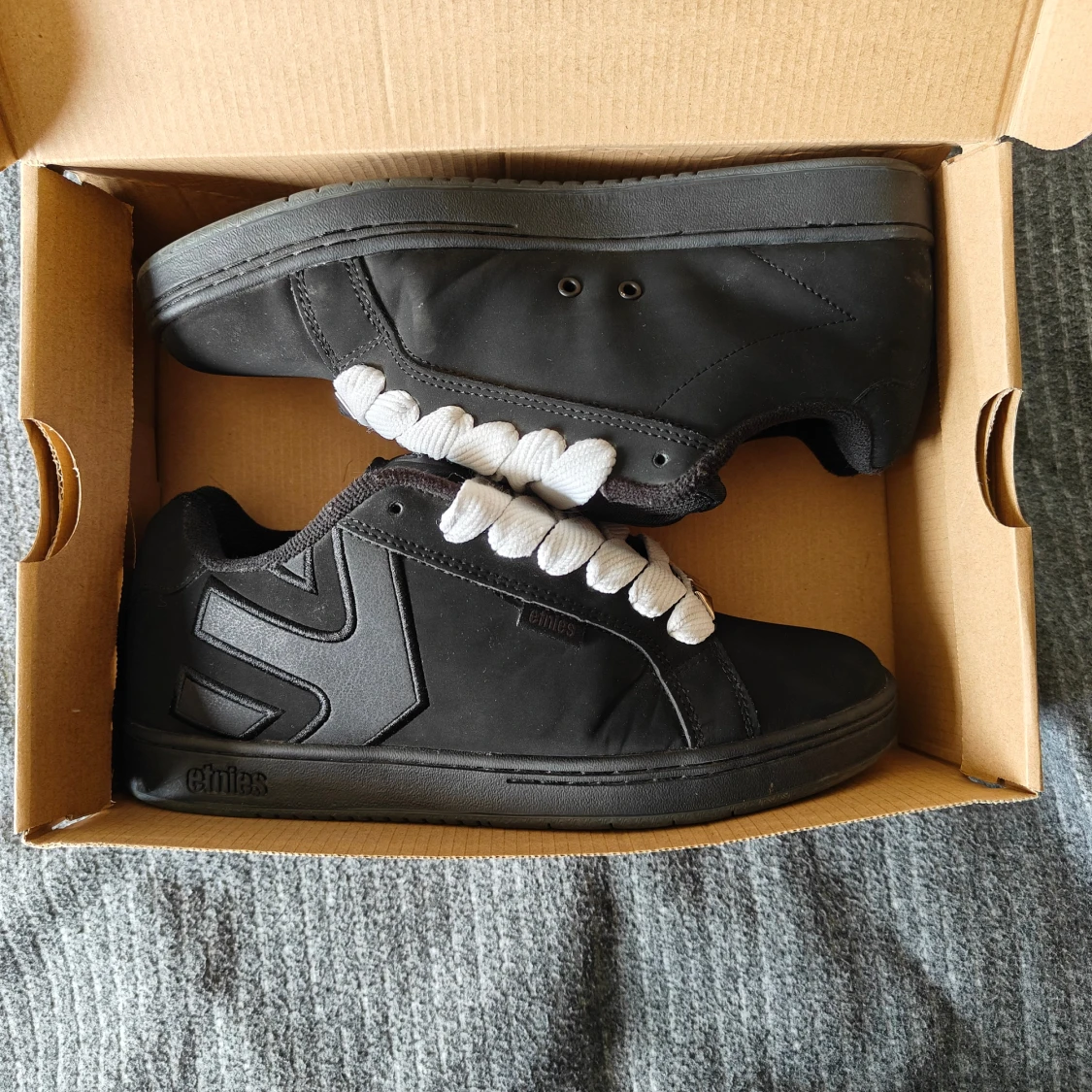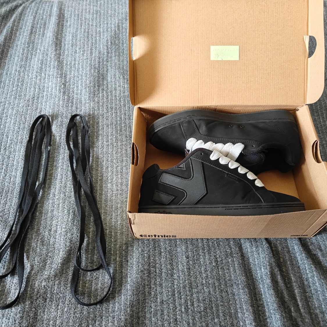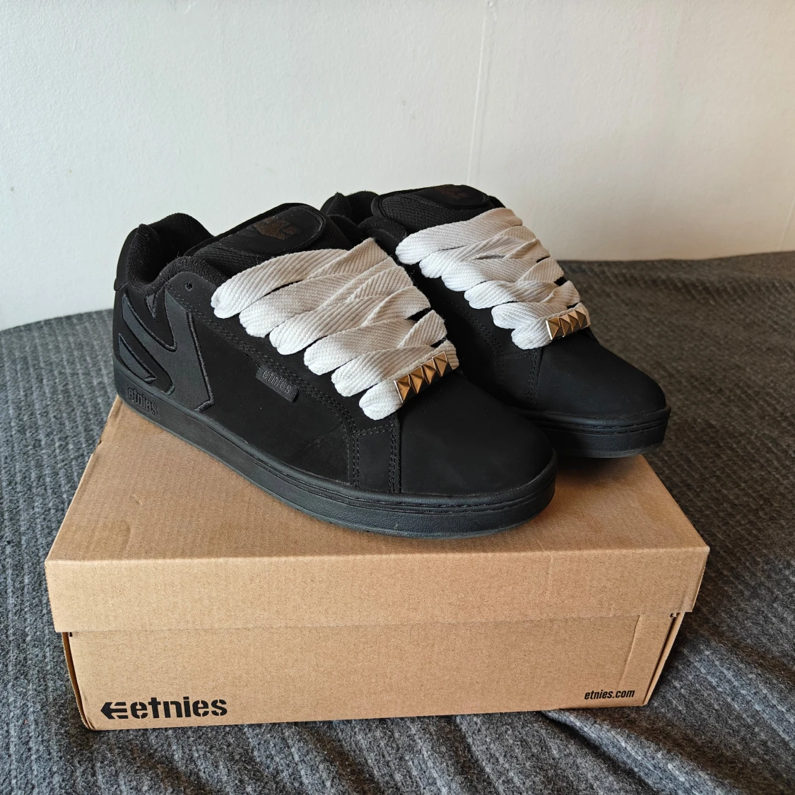 Svarta Etnies sneakers med breda vita skosnören. Svarta skosnören ingår. Skorna har en klassisk låg profil, rund tå och platt sula. Materialet är en mix av mocka och syntet. Bara använda 3 gånger Nypris: 999kr.