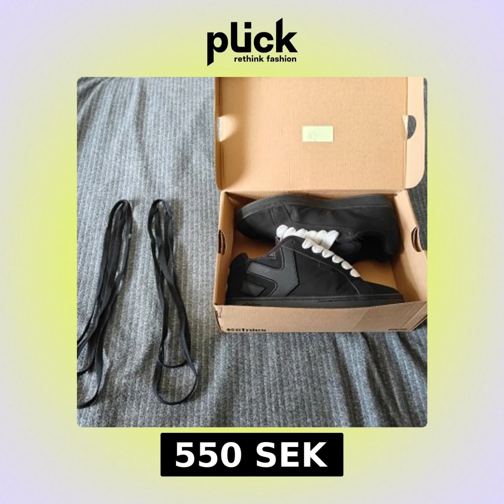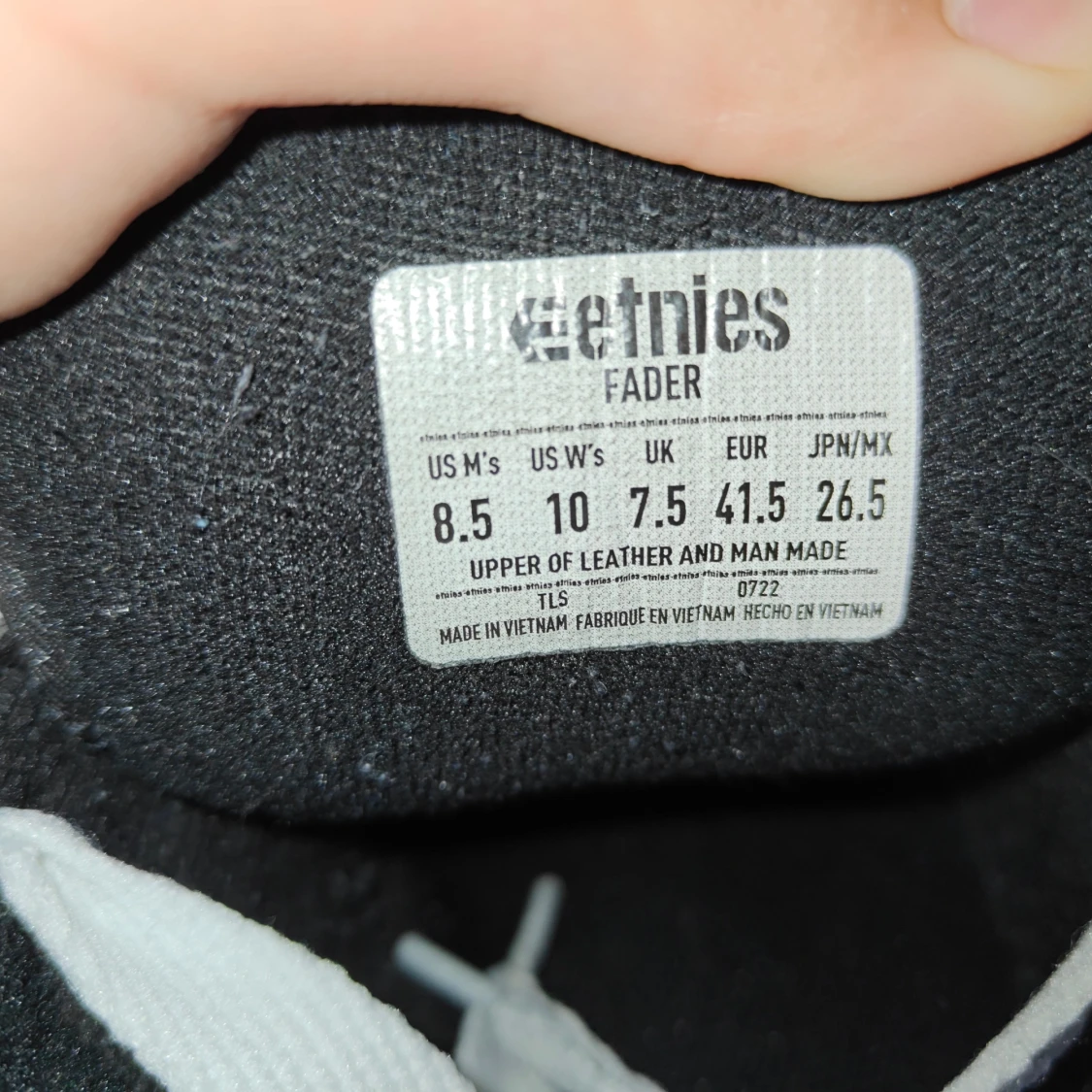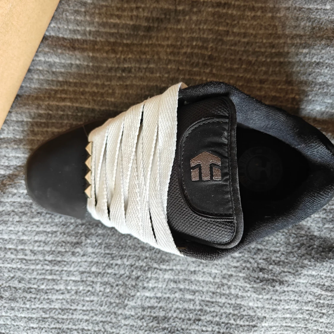 Svarta Etnies sneakers med breda vita skosnören. Svarta skosnören ingår. Skorna har en klassisk låg profil, rund tå och platt sula. Materialet är en mix av mocka och syntet. Bara använda 3 gånger Nypris: 999kr.