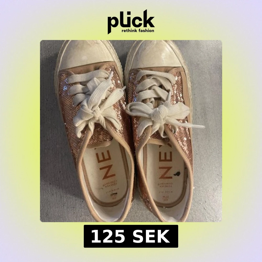 Snygga sneakers från Next med glittriga paljetter i roséguld och bred passform. Skorna har vita snören, rund tå och platt sula. Perfekta för dig som vill sticka ut med lite extra bling i vardagen.