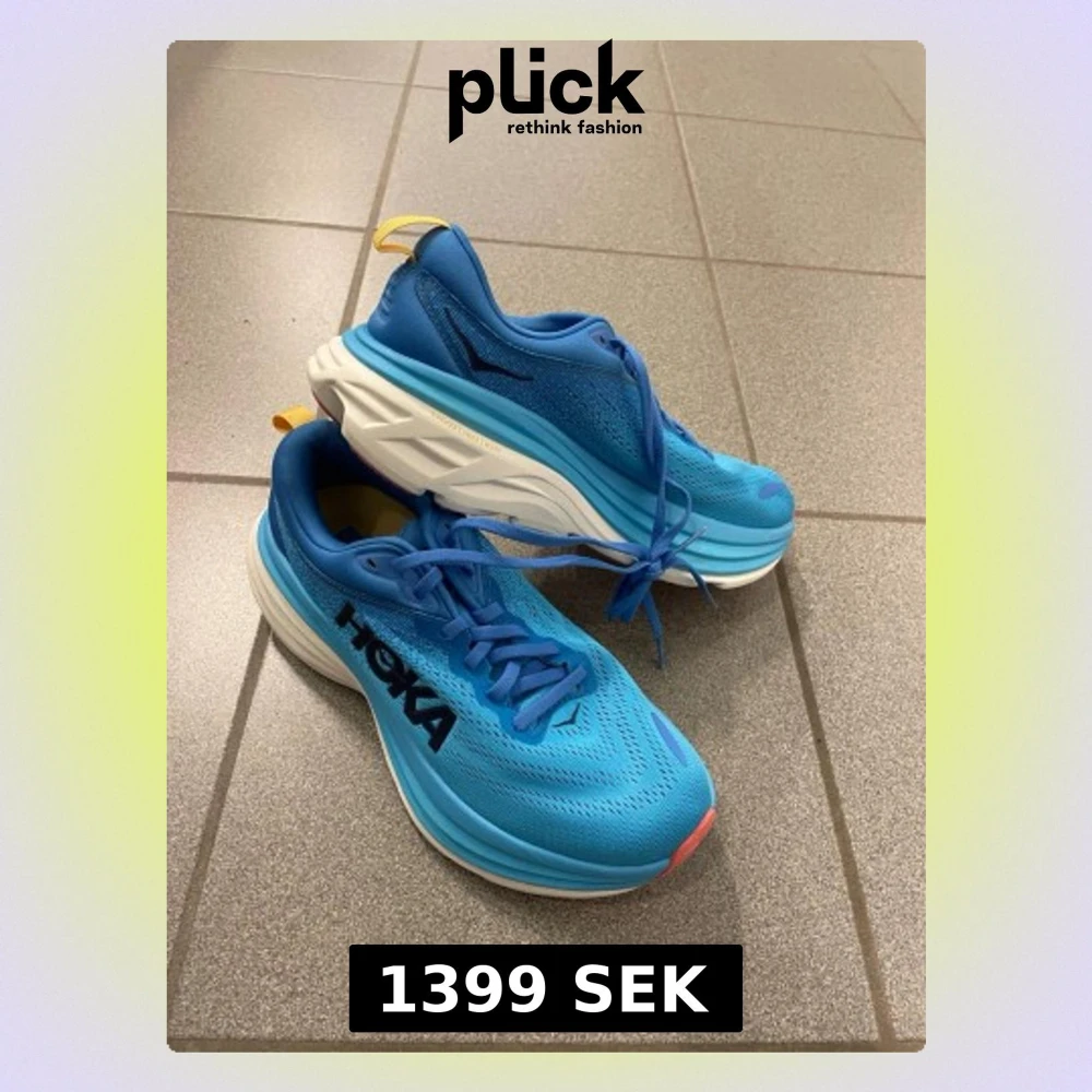 Säljer ett par Hoka Bondi 8 sneakers i klarblå färg med vit och rosa sula. Skorna har mesh-ovandel, snörning och Hoka-logga på sidan. Mellansulan är extra tjock för maxad dämpning och komfort. Perfekta för dig som gillar att springa långt och vill ha riktigt sköna skor.