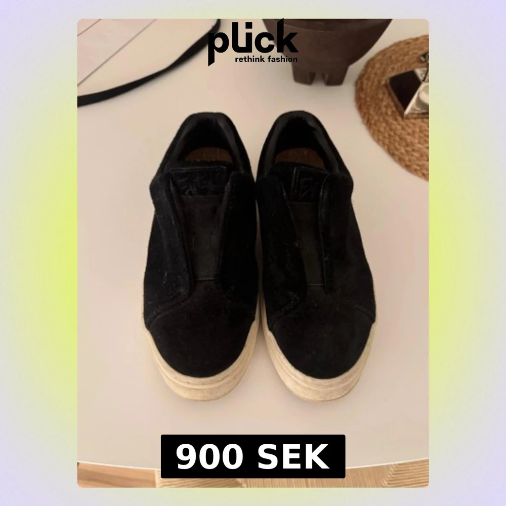 Svarta slip-on sneakers från Eytys med tjock vit sula och lila detalj på hälen. Ovandelen är i mocka och insidan har en bekväm innersula. Dom är i storlek 37 och har använt dom 2-3 gånger vilket man kan se att dom är i nytt skick 💞💞
