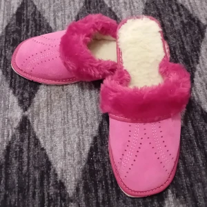 Rosa fårskinnstoffor med innersula av naturull. Storlek 37. Längd 23,5cm. Oanvända.