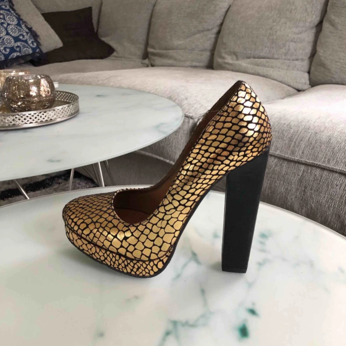 Guld- och svartmönstrade klackar med platå i storlek 39. Endast använda en gång. Möts upp i Stockholm eller så står köparen för frakten 😁