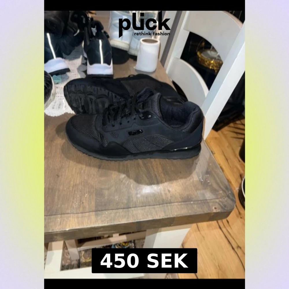 Säljer ett par helsvarta Fila sneakers med snygga meshpaneler och klassisk snörning. Skorna har en platt sula och rund tå, vilket gör dem riktigt bekväma. Perfekta för dig som gillar en clean och sportig look. Fila-logga bak på hälen.