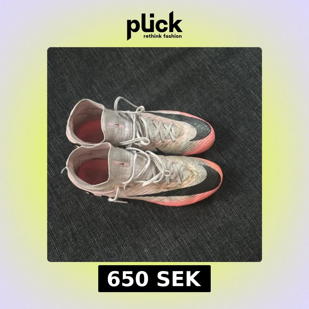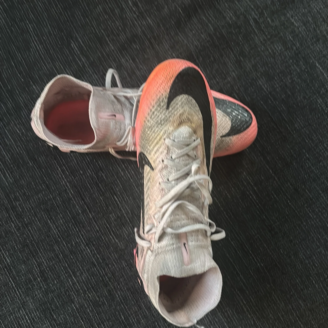 Säljer ett par Nike Zoom fotbollsskor i rosa och svarta detaljer. Skorna har snörning och en platt sula med dobbar, perfekt för spel på gräs. Snygg design med stor svart swoosh på sidan. Det är elite. Bag ingår!