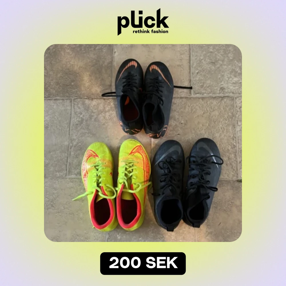 3 par fotbollskor 2 inomhus o en utomhus. Använda men e fortfarande i bra skicka. Dom gröna är i strl 38,5. Helsvarta strl 37,5. Svart orange strl 36. De bara o skriva om ni har några frågor. 200 kr för alla 80 kr styck. Pris går o diskutera.