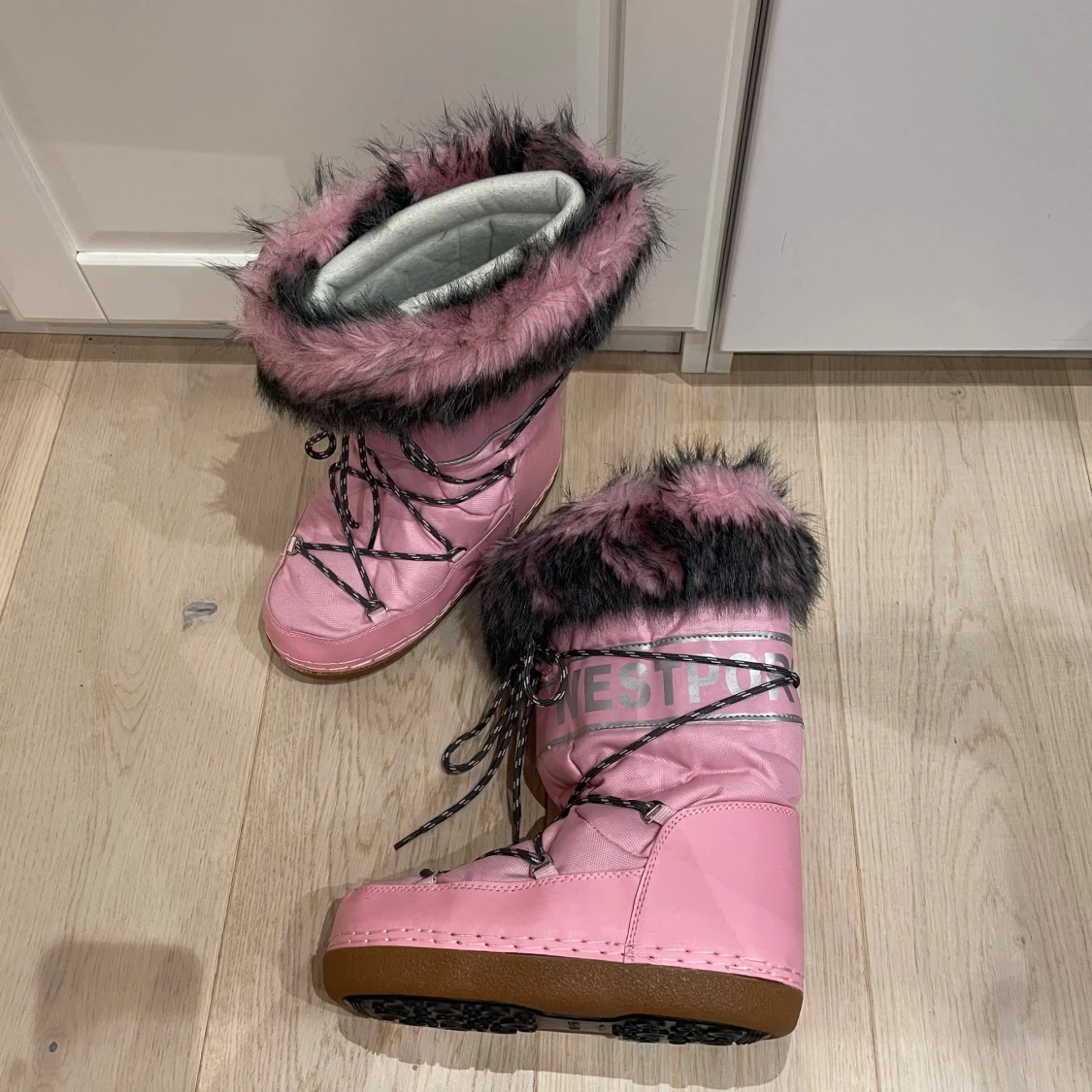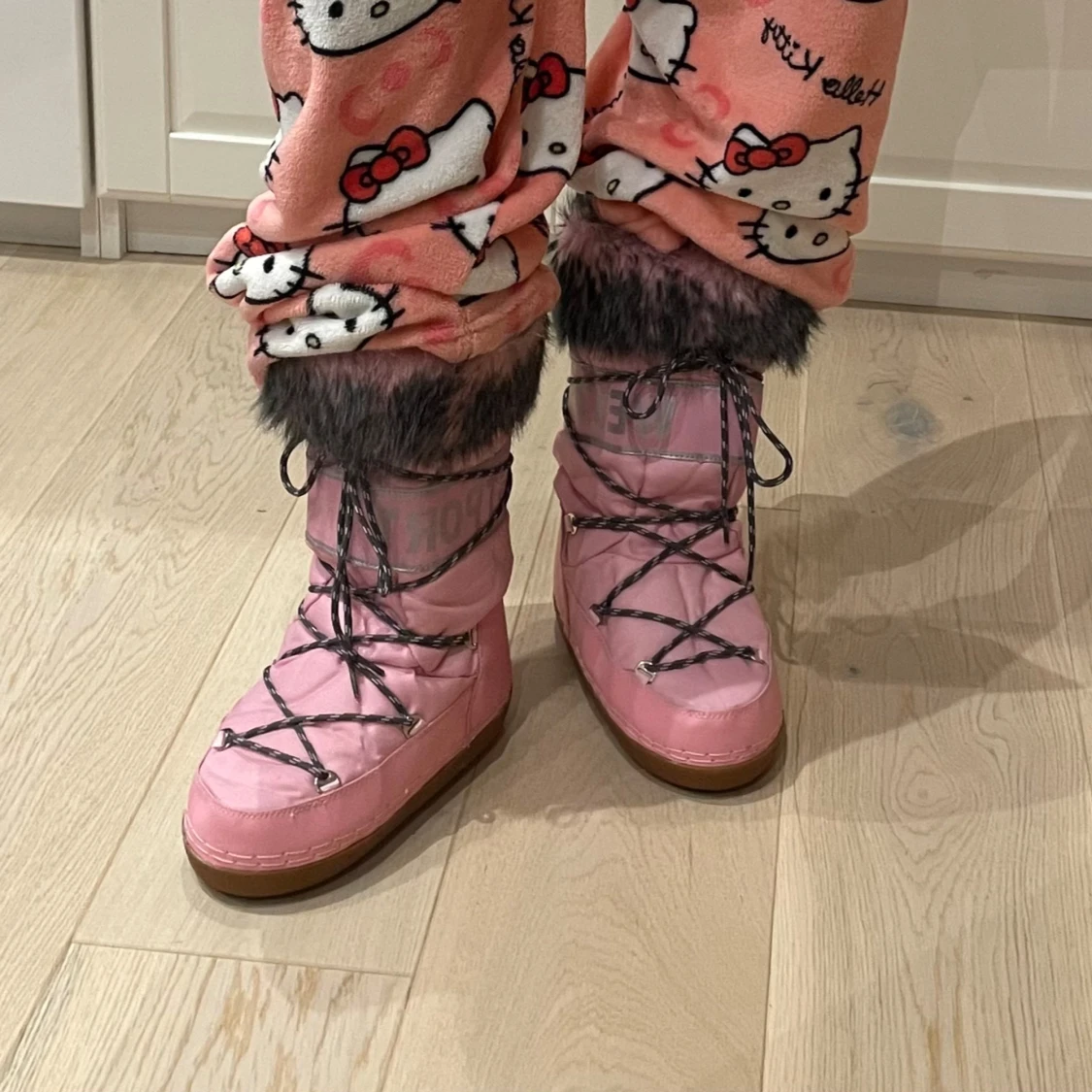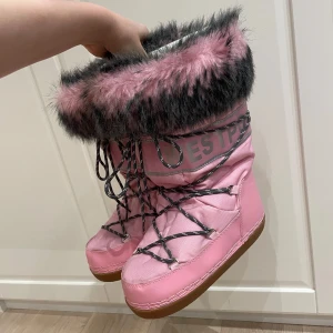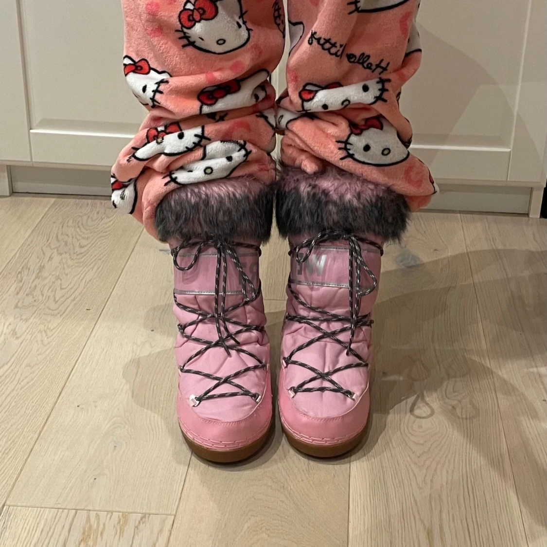 Ett MÅSTE i garderoben om man gillar y2k😻Egentligen storlek 35 men jag har klippt upp ”foderstöveln” inuti för att få dem att passa en 37-38 men känns inte vid användning🫶🏻pga detta vet jag dock inte exakt hur vattentåliga de är men funkar super i snö. Vill man att de ska passa mindre storlek igen kan man limma ihop fodret igen🩷 Utöver detta inga andra uppenbara defekter!!!!