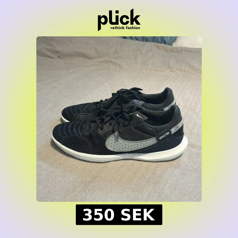 Säljer NIKE STREETGATO futsal med grå Nike märke och vita platta sulor. Skorna har snörning, rund tå och detaljer i mesh och mocka för extra stil. Perfekt för dig som gillar sportig och clean look. Snygga kontraster mellan svart och grått gör dem riktigt fräscha. Jag säljer skorna då jag inte kan skicka tillbaka de och har fått en knä skada vilket gör att jag inte mer kommer kunna spela fotboll. Jag har tyvärr inte boxen längre men de har aldrig används