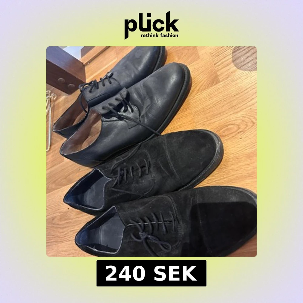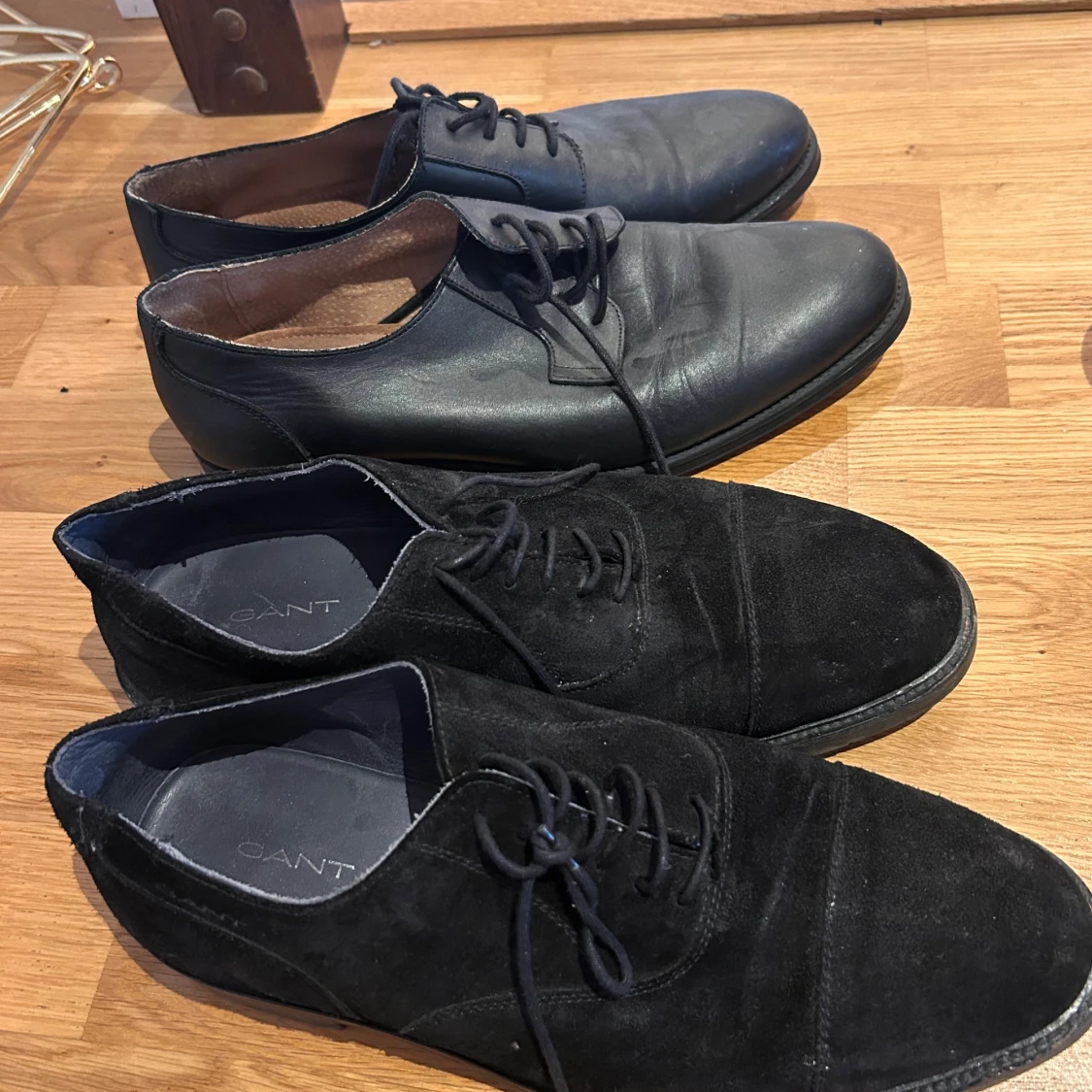Två par klassiska svarta finskor, ett par i mocka från Gant med rund tå och snörning, samt ett par i slätt svart skinn med snörning. Perfekta till kostym eller dressade outfits. Båda paren har platt sula och stilren design.