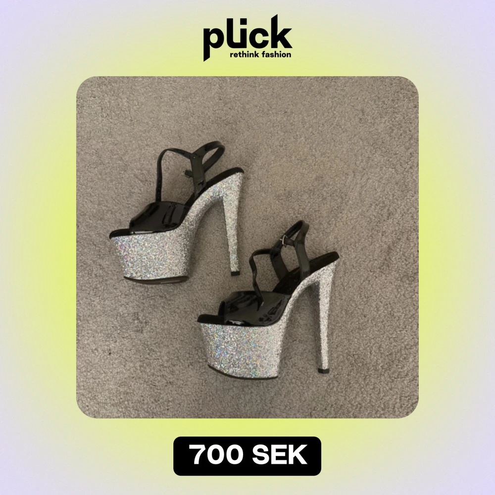 Säljer ett par superglittriga platåskor med hög klack. De har en svart remdesign och är perfekta för en utekväll eller fest. Skorna är i mycket bra skick och ger en riktig wow-effekt med sitt glittrande utseende.