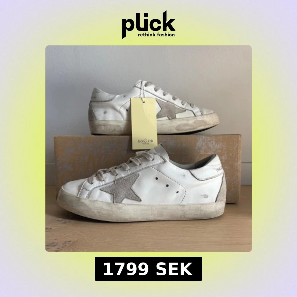 Golden Goose sneakers i vitt skinn med grå stjärna i mocka. Skorna har grå snörning. Snyggt slitna detaljer och logga baktill. Skorna är i storlek 38 vilket motsvarar att skorna passar dig om du har en fot som är ungefär 23 - 23,5 cm lång 🩷. Skick 7/10. Säljer för att dem tyvärr är för små. Ena skon är lite skadad på sulan (Se bild). Golden goose låda och tag ingår. SKRIV OM FRÅGOR ELLER FÖR FLER BILDER!🩷🩷