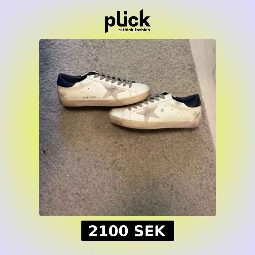 Golden Goose sneakers i vitt skinn med grå mockastjärna på sidan och mörkblå hälkappa. Grå snörning och platt sula. Klassisk och stilren modell med rund tå och diskreta detaljer. Perfekta för dig som gillar en clean men ändå unik look. Skorna är i storlek 43