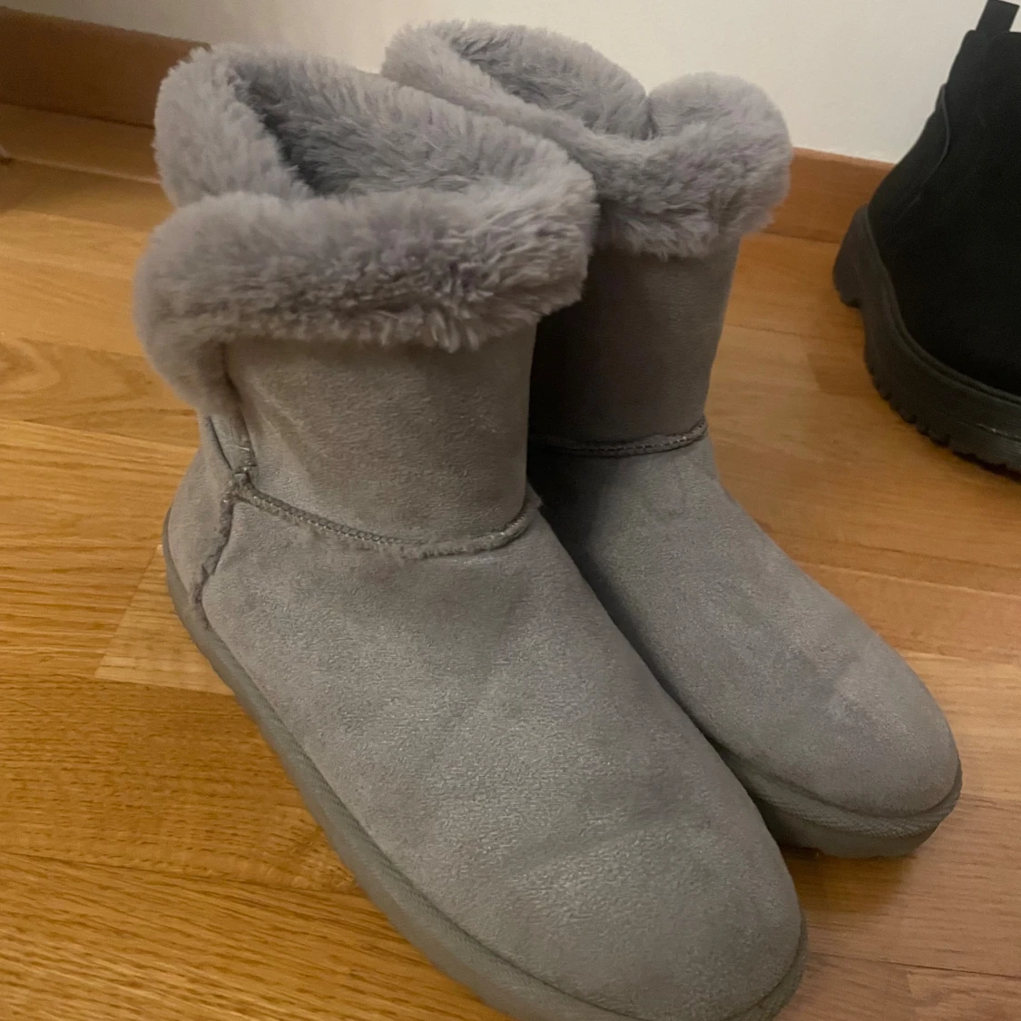 Mysiga grå boots med mjukt, fluffigt foder och rund tå. Skorna har en platt sula och är perfekta för kalla dagar. Utsidan är i mocka och insidan är fodrad för extra värme och komfort. Passar även som 37