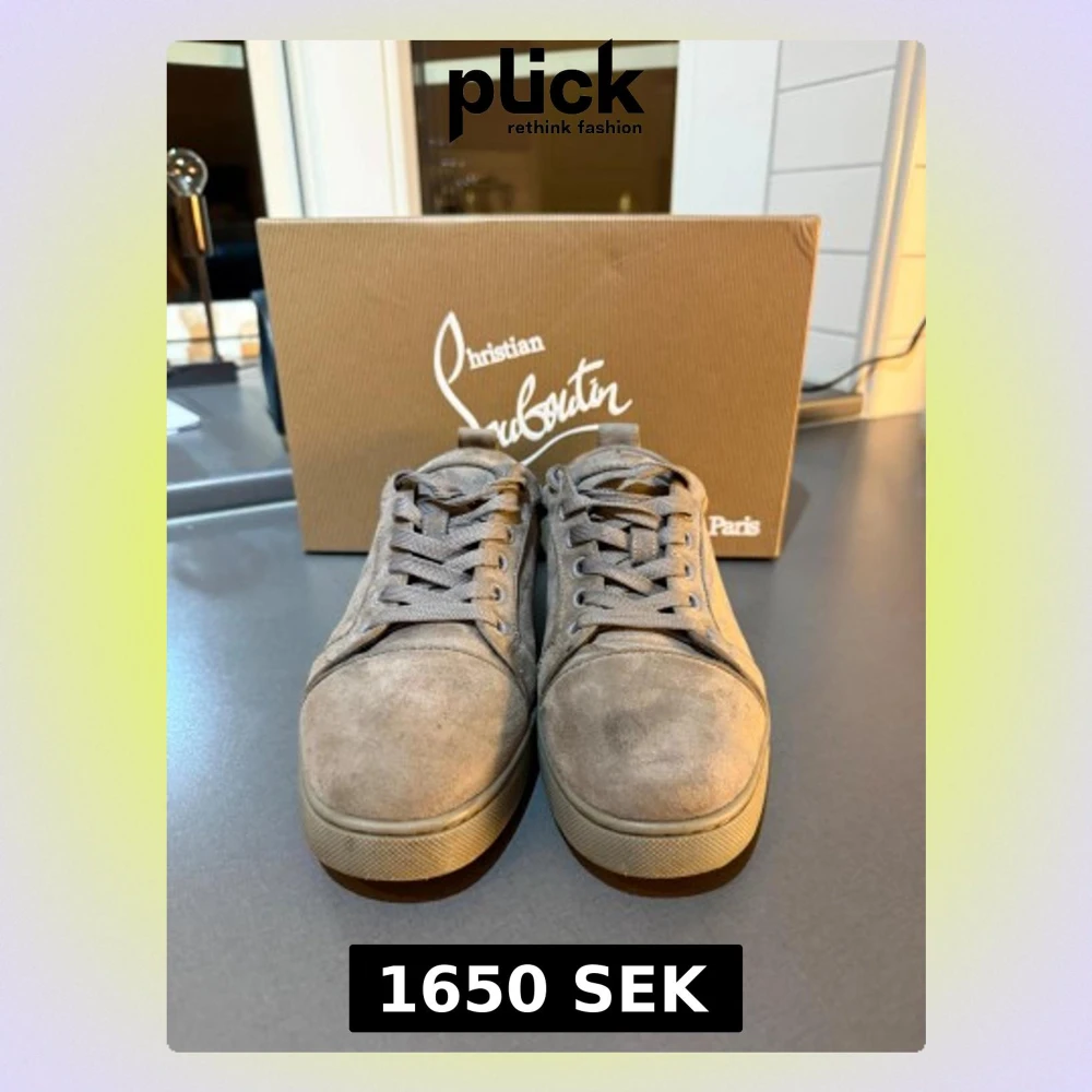 Grå mocka sneakers Christian Louboutin - Säljer ett par grå sneakers från Christian Louboutin i mocka med coola nitar på tån och klassisk röd sula. Skorna har har tyvärr 2 små hål ett på baksidan och ett inuti men inget av hålen syns när man har på sig skorna, säljer de tyvärr föt jag har växt ur de och vill ha en ny ägare istället för att de slängs, ny pris ligger på 7000 kr och jag säljer endast de för 2300 kr hör gärna av er om ni har några frågor, priset är inte helt fast kan säljas lite billigare vid en snabb affär🌟