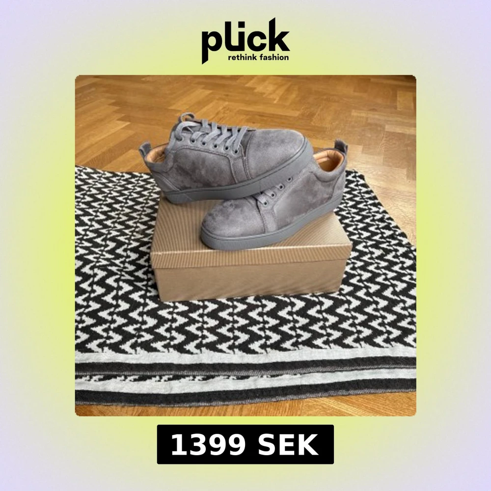 Säljer ett par grå sneakers från Christian Louboutin i mjuk mocka med klassisk röd sula och rund tå. Skorna har snörning och diskreta detaljer, samt en lyxig innersula i beige läder.