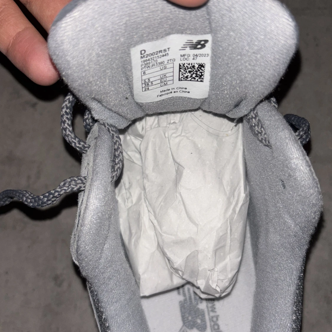 Säljer ett par grå New Balance 2002R sneakers med meshpaneler och mockadetaljer. Skorna har en vit och svart sula, klassisk N-logga på sidan och snörning framtill. Perfekta för dig som gillar stilrena och bekväma sneakers.