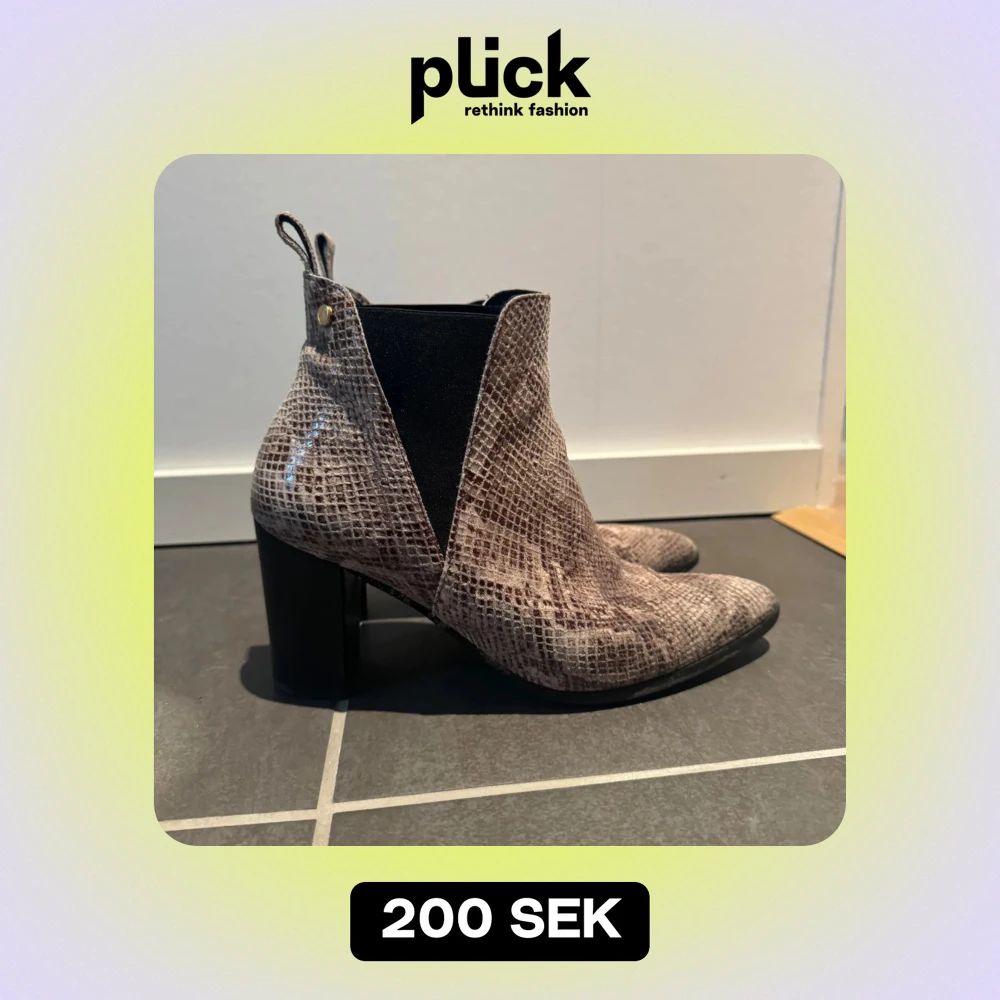Snygga grå boots med ormskinnsmönster och klack. De har en dragkedja på sidan för enkel på- och avtagning. Perfekta för höst och vår, och ger en cool touch till vilken outfit som helst. Använd dem till både vardags och fest!