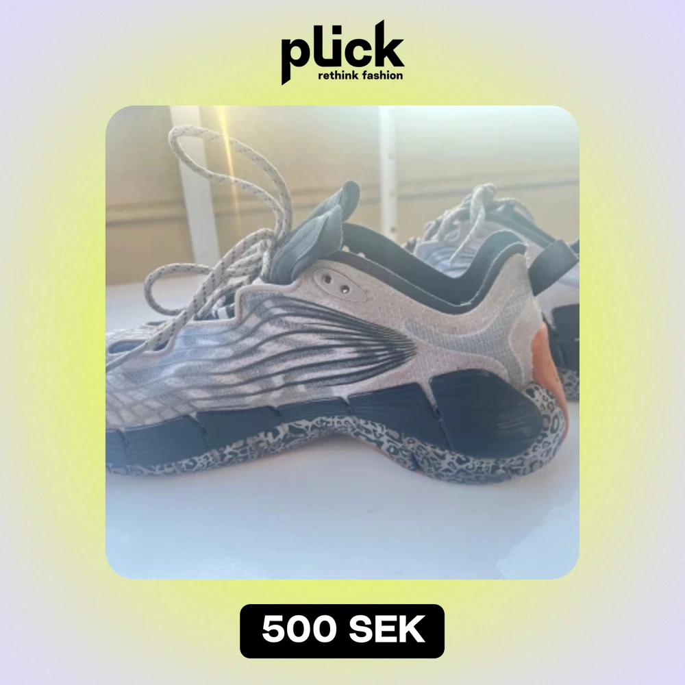 Säljer ett par gråa sneakers från Reebok i storlek 40,5-41. Skorna har en cool design med leopardmönster på sulan och orange detaljer på hälen. De är tillverkade i syntetmaterial och har snörning framtill. Perfekta för träning eller vardagsbruk!