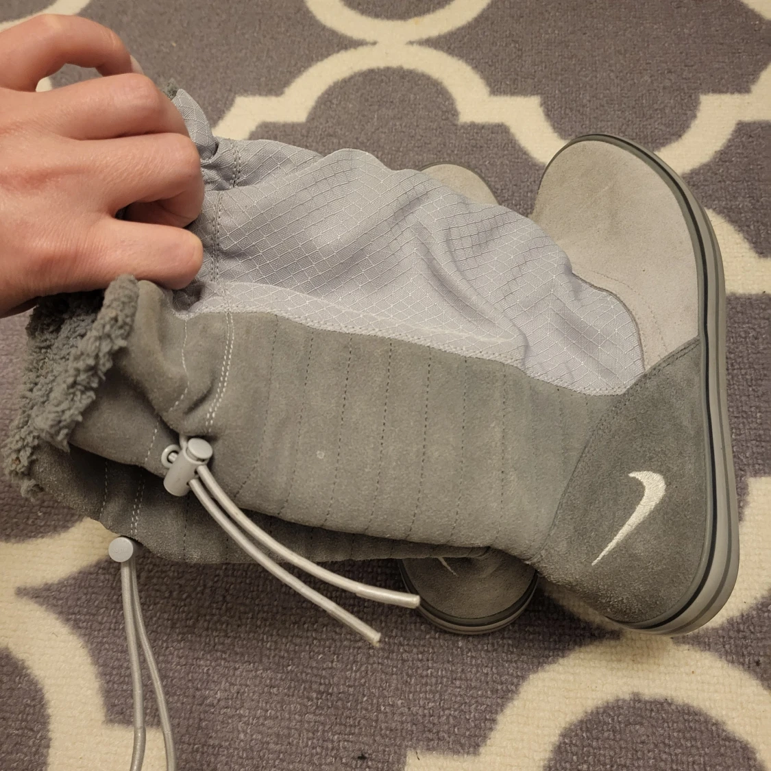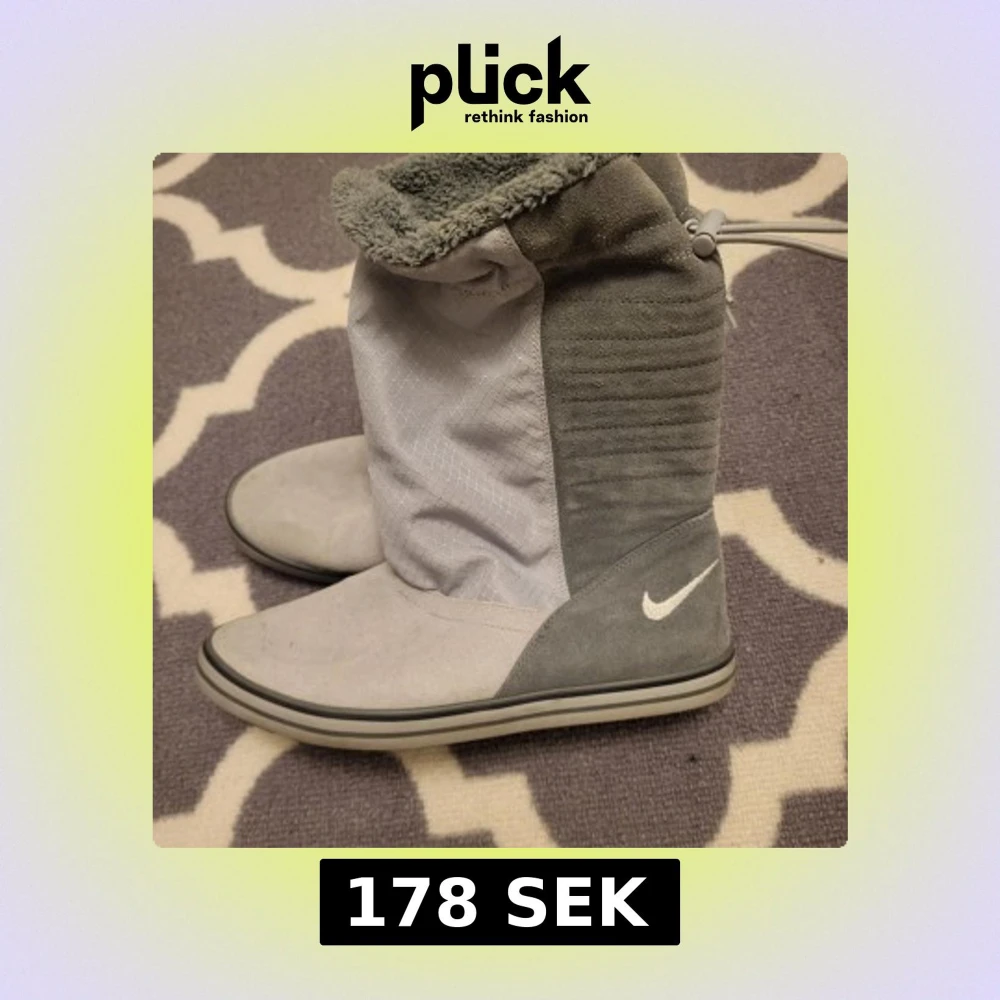 Säljer ett par grå vinterstövlar från Nike med en mjuk insida och justerbar dragsko upptill. Perfekta för kalla dagar med sin varma och bekväma design. Nike-loggan syns på sidan av stövlarna.