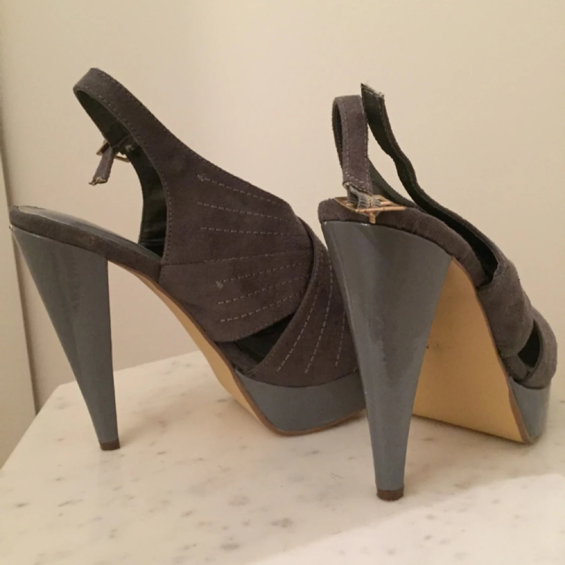 Skyhöga klackar i mocka. Använda men i bra second handskick.